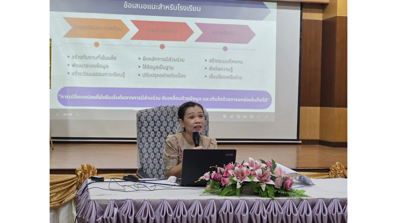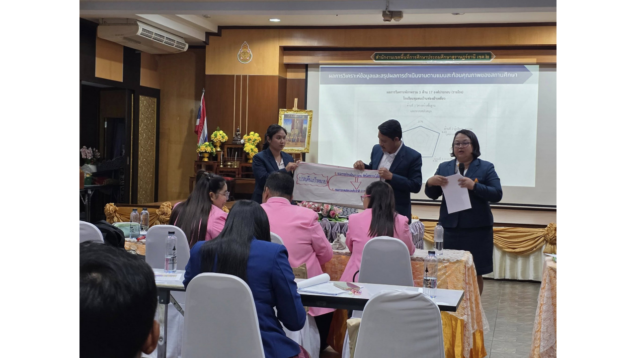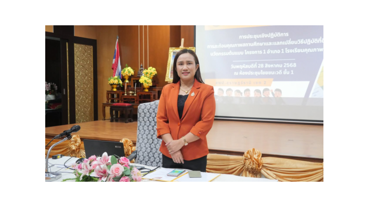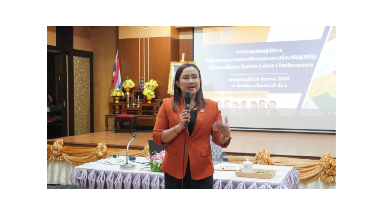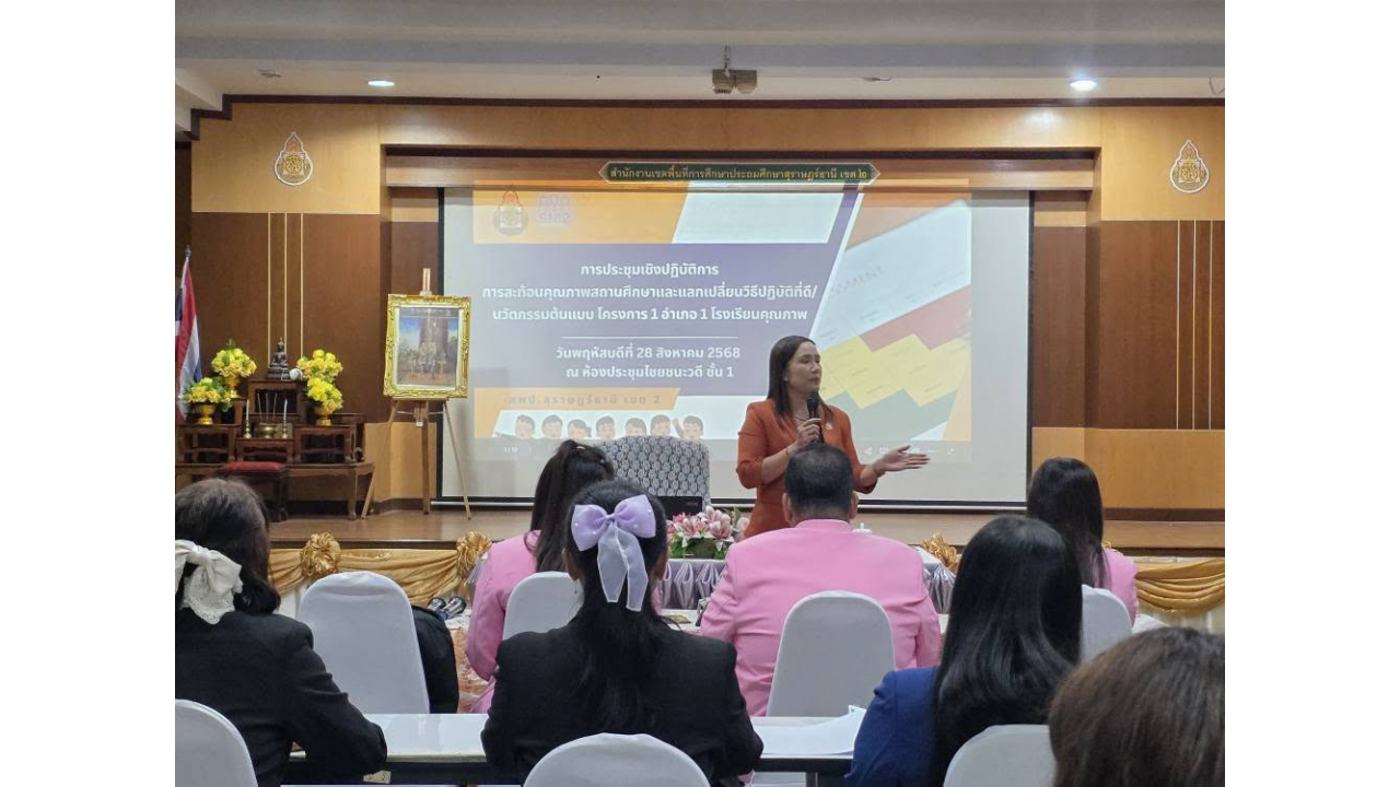 วันพฤหัสบดีที่ 28 สิงหาคม พ.ศ. 2568 นางสาวปวิชญา สินน้อย ผู้อำนวยการสำนักงานเขตพื้นที่การศึกษาประถมศึกษาสุราษฎร์ธานี เขต 2 เป็นประธานในการประชุมเชิงปฏิบัติการสะท้อนคุณภาพสถานศึกษาและแลกเปลี่ยนวิธีปฏิบัติที่ดี/นวัตกรรมต้นแบบ โครงการ 1 อำเภอ 1 โรงเรียนคุณภาพ พร้อมด้วยนางธัญกาญจน์ ภาสตโรจน์ รองผู้อำนวยการสำนักงานเขตพื้นที่ฯ ผู้บริหารสถานศึกษาในสังกัด ครูผู้รับผิดชอบโครงการ 1 อำเภอ 1 โรงเรียนคุณภาพ และบุคลากรที่เกี่ยวข้องเข้าร่วมประชุมอย่างพร้อมเพรียง ณ ห้องประชุมไชยชนะวดี สพป.สุราษฎร์ธานี เขต 2 ในการนี้ นางณปภัช ชูประเสริฐ ผู้อำนวยการกลุ่มนโยบายและแผน กล่าวรายงานวัตถุประสงค์ ซึ่งการประชุมจัดขึ้นเพื่อ สะท้อนผลการดำเนินงานและคุณภาพสถานศึกษา และเปลี่ยนวิธีปฏิบัติที่ดีและนวัตกรรม กำหนดเป้าหมายและแผนพัฒนาร่วมระหว่างสำนักงานเขตพื้นที่และโรงเรียนเพื่อยกระดับคุณภาพอย่างเป็นระบบ
