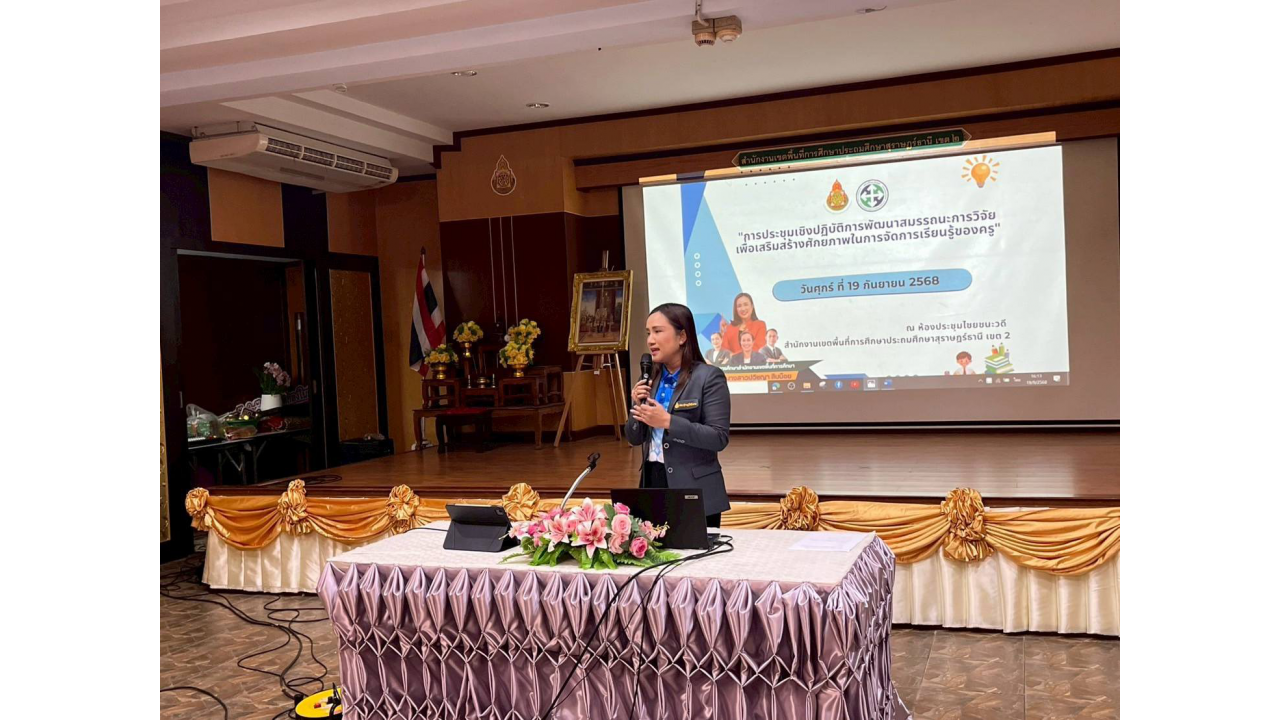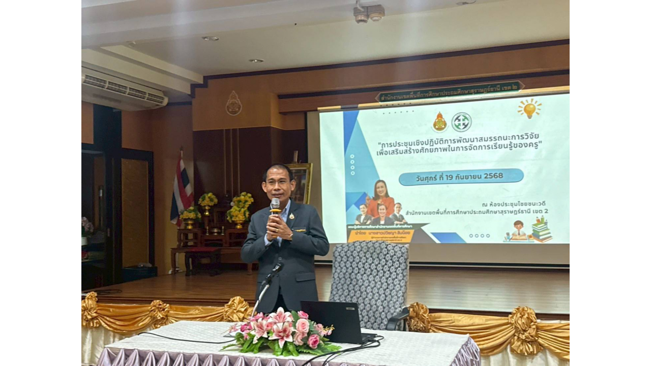 วันที่ 19 กันยายน พ.ศ. 2568 นางสาวปวิชญา สินน้อย ผู้อำนวยการสำนักงานเขตพื้นที่การศึกษาประถมศึกษาสุราษฎร์ธานี เขต 2 มอบหมายให้นายภูริพัฒน์ บุญมา รองผู้อำนวยการสำนักงานเขตพื้นที่ฯ เป็นประธานเปิดการประชุมเชิงปฏิบัติการ “การพัฒนาสมรรถนะการวิจัยเพื่อเสริมสร้างศักยภาพในการจัดการเรียนรู้ของครู” ณ ห้องประชุมไชยชนะวดี สพป.สุราษฎร์ธานี เขต 2 การประชุมครั้งนี้มีผู้เข้าร่วมจำนวน 75 คน ประกอบด้วยครูผู้สอนจากสถานศึกษาต่าง ๆ ในเขตพื้นที่ ซึ่งส่วนใหญ่เป็นครูวิชาการของโรงเรียน หรือครูผู้สอนที่สามารถนำองค์ความรู้จากการอบรมไปขยายผลให้แก่บุคลากรในโรงเรียน ทั้งจากโรงเรียนคุณภาพประจำอำเภอตามโครงการหนึ่งอำเภอหนึ่งโรงเรียนคุณภาพ โรงเรียนนำร่องในพื้นที่นวัตกรรม โรงเรียนขยายโอกาสทางการศึกษา รวมถึงโรงเรียนอื่น ๆ ที่ได้รับการพิจารณาจากผลการทดสอบทางการศึกษาระดับชาติขั้นพื้นฐาน (O-NET) เฉลี่ยรวม 4 วิชา
