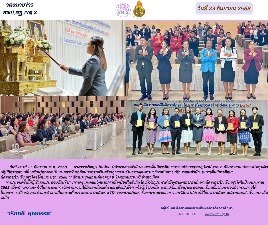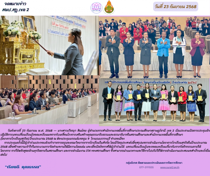 สพป.สุราษฎร์ธานี เขต 2 ประชุมเชิงปฏิบัติการแลกเปลี่ยนเรียนรู้ถอดบทเรียน ผลการขับเคลื่อนโรงการเสริมสร้างคุณธรรมจริยธรรม และธรรมาภิบาล ในสถานศึกษา และสพท. (โครงการโรงเรียนสุจริต) ปีงบประมาณ 2568 วันอังคารที่ 23 กันยายน พ.ศ. 2568 นางสาวปวิชญา สินน้อย ผู้อำนวยการสำนักงานเขตพื้นที่การศึกษาประถมศึกษาสุราษฎร์ธานี เขต 2 เป็นประธานเปิดการประชุมเชิงปฏิบัติการแลกเปลี่ยนเรียนรู้ถอดบทเรียน ผลการขับเคลื่อนโรงการเสริมสร้างคุณธรรมจริยธรรม และธรรมาภิบาล ในสถานศึกษา และสำนักงานเขตพื้นที่การศึกษา (โครงการโรงเรียนสุจริต) ปีงบประมาณ 2568 ณ ห้องประชุมแกรนด์บอลรูม 9 โรงแรมบรรจงบุรี อำเภอเมือง จังหวัดสุราษฎร์ธานี