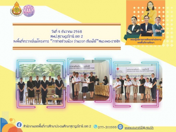 จันทร์ที่ 3 พฤศจิกายน พ.ศ. 2568 อำเภอพุนพิน ได้แก่ โรงเรียนวัดท่าตลิ่งชัน นำโดย นางสาวปวิชญา สินน้อย ผู้อำนวยการสำนักงานเขตพื้นที่การศึกษาประถมศึกษาสุราษฎร์ธานี เขต 2 พร้อมด้วย