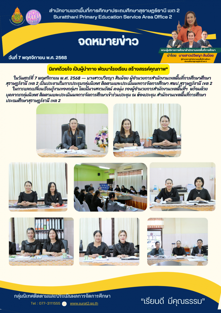 วันที่ 7 พฤศจิกายน พ.ศ. 2568 — นางสาวปวิชญา สินน้อย ผู้อำนวยการสำนักงานเขตพื้นที่การศึกษาประถมศึกษาสุราษฎร์ธานี เขต 2 เป็นประธานในการประชุมกลุ่มนิเทศ ติดตามและประเมินผลการจัดการศึกษา สพป.สุราษฎร์ธานี เขต 2 เพื่อติดตามการดำเนินงานและแลกเปลี่ยนเรียนรู้งานของกลุ่มฯ โดยมีนางสงวนรัตน์ คงนุ่ม รองผู้อำนวยการสำนักงานเขตพื้นที่การศึกษาประถมศึกษาสุราษฎร์ธานี เขต 2 พร้อมด้วยบุคลากรกลุ่มนิเทศ ติดตามและประเมินผลการจัดการศึกษาเข้าร่วมประชุม ณ ห้องประชุม สำนักงานเขตพื้นที่การศึกษาประถมศึกษาสุราษฎร์ธานี เขต 2
