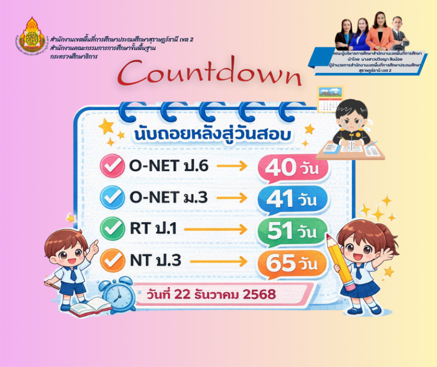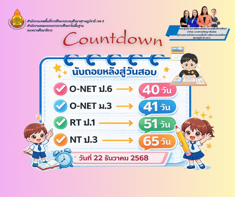 สพป.สุราษฎร์ธานี เขต 2 Countdown ถอยหลังสู่วันสอบ #O-NET #RT #NT นักเรียนวางแผนการอ่านหนังสือให้ดี แบ่งเวลาพักผ่อนให้เพียงพอ ความพยายามอยู่ที่ใหน ความสำเร็จอยู่ที่นั้น! สพป.สุราษฎร์ธานี เขต 2 เป็นกำลังใจให้ทุกคนค่ะ