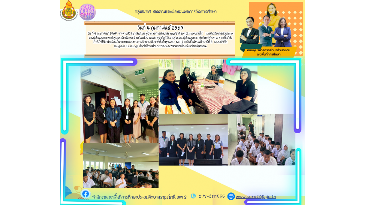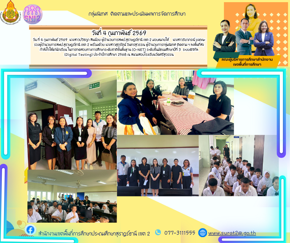 วันที่ 4 กุมภาพันธ์ 2569 นางสาวปวิชญา สินน้อย ผู้อำนวยการสพป.สุราษฎร์ธานี เขต 2 มอบหมายให้ นางสาวริยาภรณ์ ยงคณะ รองผู้อำนวยการสพป.สุราษฎร์ธานี เขต 2 ลงพื้นที่ส่งกำล้งใจให้นักเรียนชั้นมัธยมศึกษาปีที่ 3 ในการทดสอบทางการศึกษาระดับชาติขั้นพื้นฐาน (O-NET) ด้วยระบบดิจิทัล (Digital Testing) ประจำปีการศึกษา 2568 ณ สนามสอบโรงเรียนวัดศรีสุวรรณ