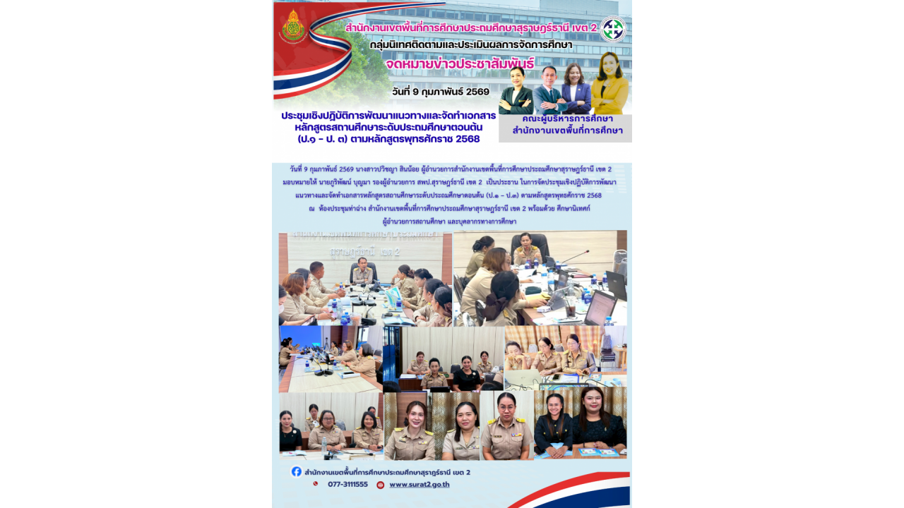 วันที่ 9 กุมภาพันธ์ 2569 นางสาวปวิชญา สินน้อย ผู้อำนวยการสำนักงานเขตพื้นที่การศึกษาประถมศึกษาสุราษฎร์ธานี เขต 2 มอบหมายให้ นายภูริพัฒน์ บุญมา รองผู้อำนวยการสำนักงานเขตพื้นที่การศึกษาประถมศึกษาสุราษฎร์ธานี เขต 2 เป็นประธานในการประชุมคณะกรรมการบริหารงานหลักสูตร เพื่อดำเนินการขับเคลื่อนตาม "โครงการพัฒนาหลักสูตรทั้งระบบ" ณ ห้องประชุมท่าฉาง สพป.สุราษฎร์ธานี เขต 2