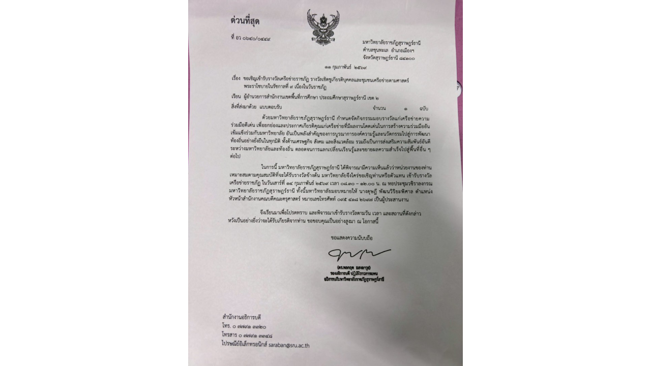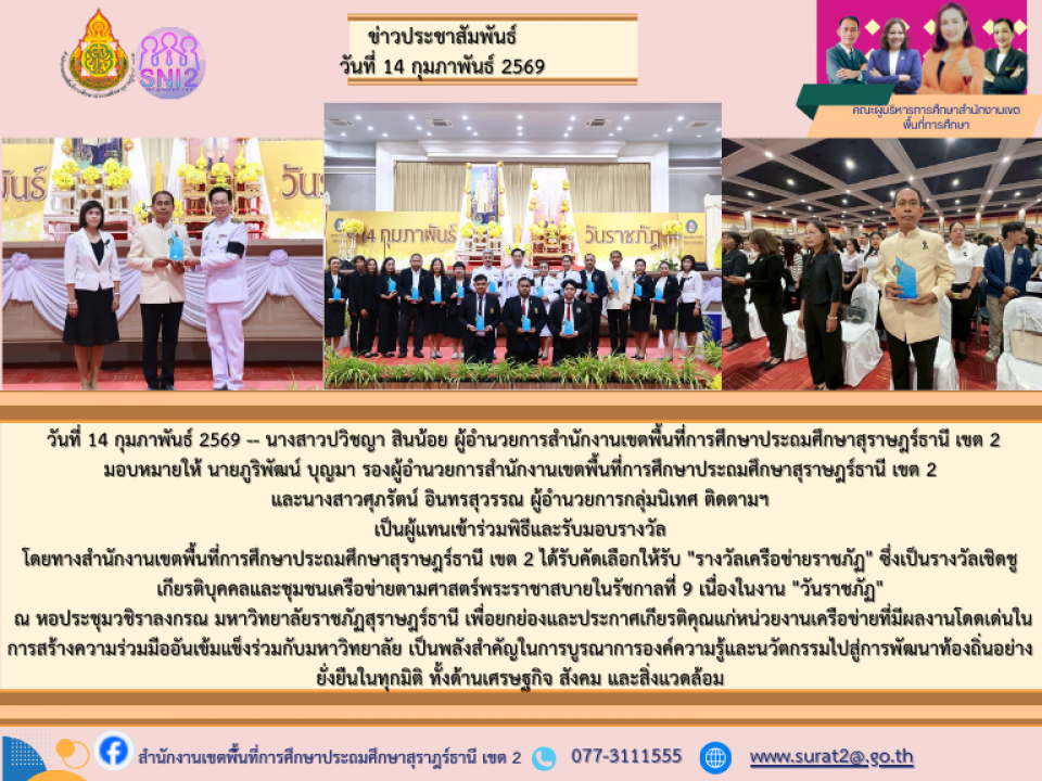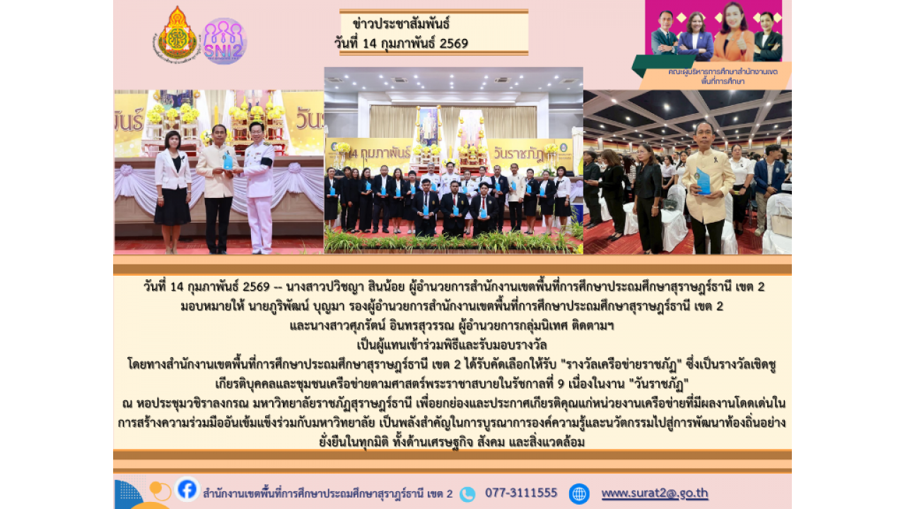 วันเสาร์ที่ 14 กุมภาพันธ์ 2569 เวลา 08.30 น.  นางสาวปวิชญา สินน้อย ผู้อำนวยการสำนักงานเขตพื้นที่การศึกษาประถมศึกษาสุราษฎร์ธานี เขต 2 มอบหมายให้                            นายภูริพัฒน์ บุญมา รองผู้อำนวยการสำนักงานเขตพื้นที่การศึกษาประถมศึกษาสุราษฎร์ธานี เขต 2 พร้อมด้วย นางสาวศุภรัตน์ อินทรสุวรรณ ผู้อำนวยการกลุ่มนิเทศ ติดตาม และประเมินผลการจัดการศึกษา เป็นผู้แทนเข้าร่วมพิธีและรับมอบรางวัล