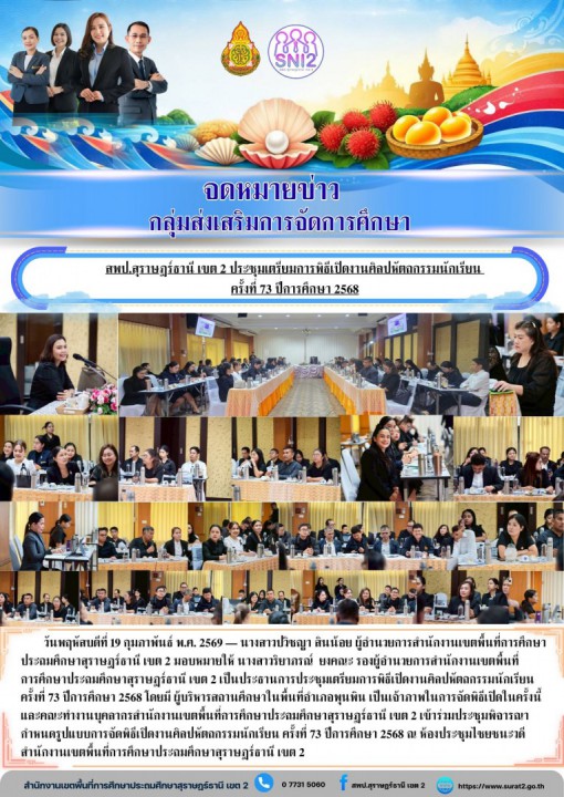 วันพฤหัสบดีที่ 19 กุมภาพันธ์ พ.ศ. 2569 — นางสาวปวิชญา สินน้อย ผู้อำนวยการสำนักงานเขตพื้นที่การศึกษาประถมศึกษาสุราษฎร์ธานี เขต 2 มอบหมายให้ นางสาวริยาภรณ์ ยงคณะ รองผู้อำนวยการสำนักงานเขตพื้นที่