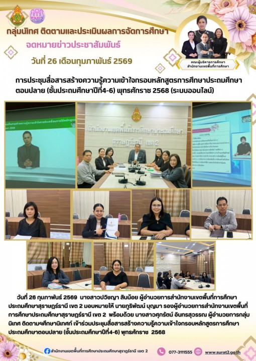 วันที่ 26 กุมภาพันธ์ 2569 นางสาวปวิชญา สินน้อย ผู้อำนวยการสำนักงานเขตพื้นที่การศึกษาประถมศึกษาสุราษฎร์ธานี เขต 2 มอบหมายให้ นายภูริพัฒน์ บุญมา รองผู้อำนวยการสำนักงานเขตพื้นที่การศึกษาประถมศึกษาสุราษฎร์ธานี เขต 2 พร้อมด้วยนางสาวศุภรัตน์ อินทรสุวรรณ ผู้อำนวยการกลุ่มนิเทศ ติดตาม ฯ ศึกษานิเทศก์ เข้าร่วมประชุมสื่อสารสร้างความรู้ความเข้าใจกรอบหลักสูตรการศึกษาประถมศึกษาตอนปลาย (ชั้นประถมศึกษาปีที่4-6) พุทธศักราช 2568 เพื่อให้สถานศึกษา สามารถนำความรู้ ความเข้าใจ ทักษะ และคุณลักษณะต่าง ๆ ไปประยุกต์ใช้