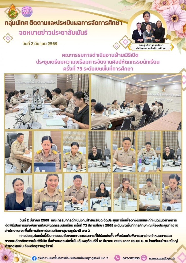 วันที่ 2 มีนาคม 2569 คณะกรรมการดำเนินงานฝ่ายพิธีเปิด จัดประชุมหารือเพื่อวางแผนและกำหนดแนวทางการจัดพิธีเปิดการแข่งขันงานศิลปหัตถกรรมนักเรียน ครั้งที่ 73 ปีการศึกษา 2568 ระดับเขตพื้นที่การศึกษา ณ ห้องประชุมท่าฉาง สำนักงานเขตพื้นที่การศึกษาประถมศึกษาสุราษฎร์ธานี เขต 2