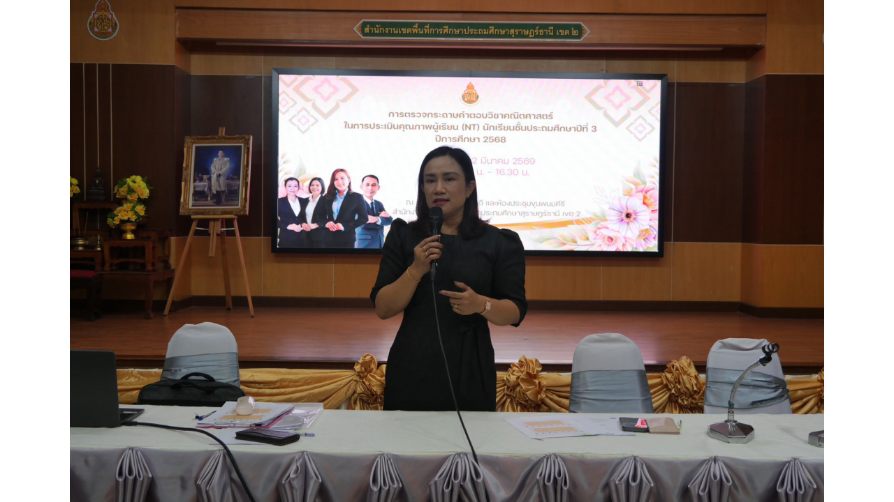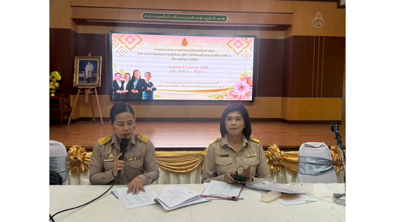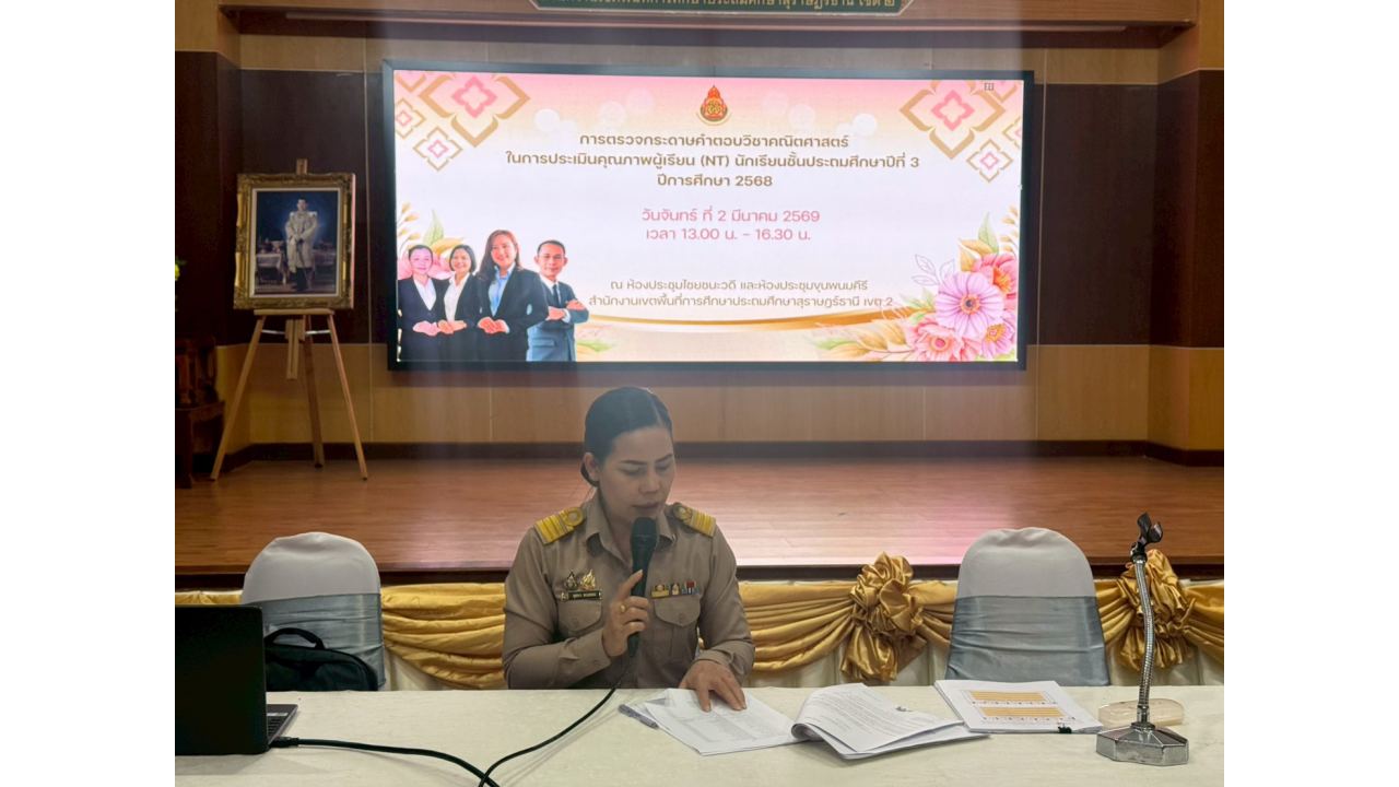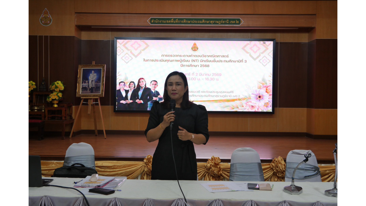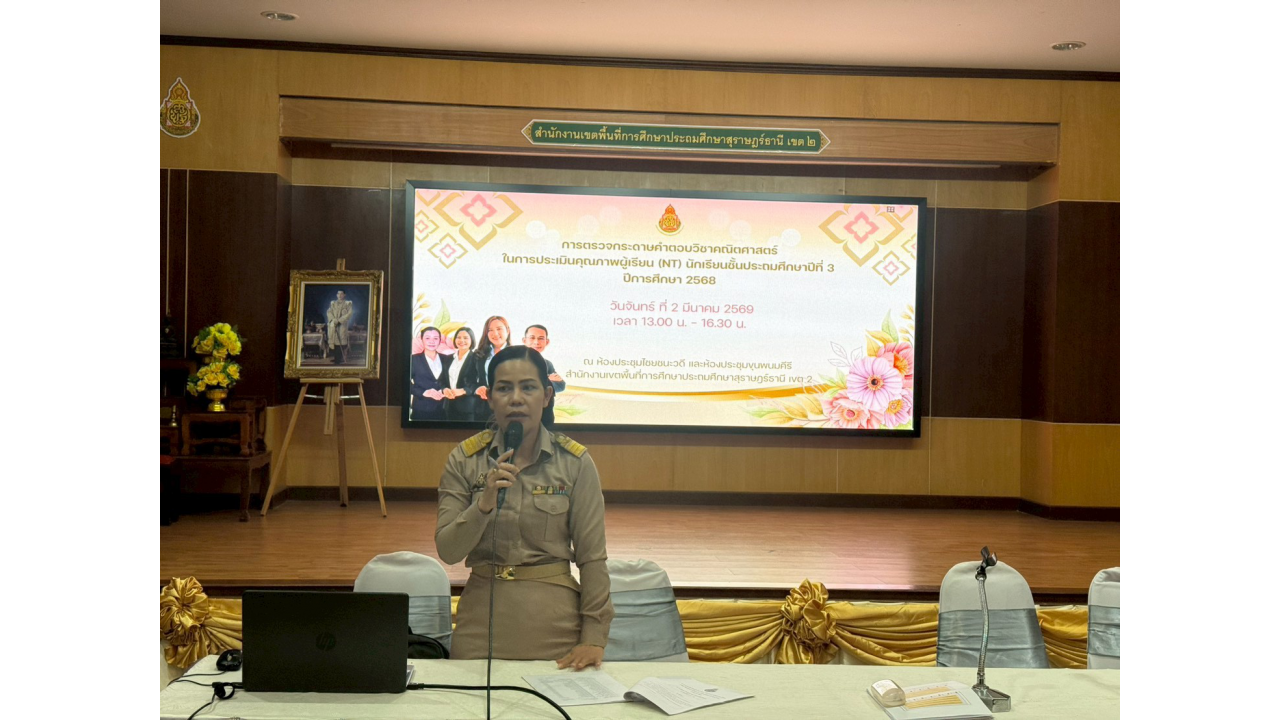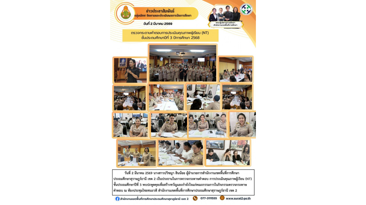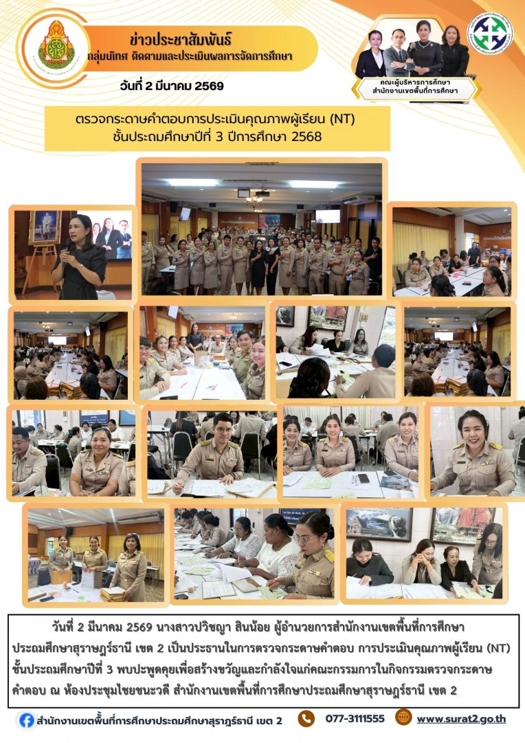 วันจันทร์ที่ 2 มีนาคม 2569 – นางสาวปวิชญา สินน้อย ผู้อำนวยการสำนักงานเขตพื้นที่การศึกษาประถมศึกษาสุราษฎร์ธานี เขต 2 เป็นประธานในการตรวจเยี่ยมและพบปะพูดคุยเพื่อสร้างขวัญและกำลังใจแก่คณะกรรมการในกิจกรรมตรวจกระดาษคำตอบ การประเมินคุณภาพผู้เรียน (NT) ชั้นประถมศึกษาปีที่ 3 ปีการศึกษา 2568 ณ สำนักงานเขตพื้นที่การศึกษาประถมศึกษาสุราษฎร์ธานี เขต 2