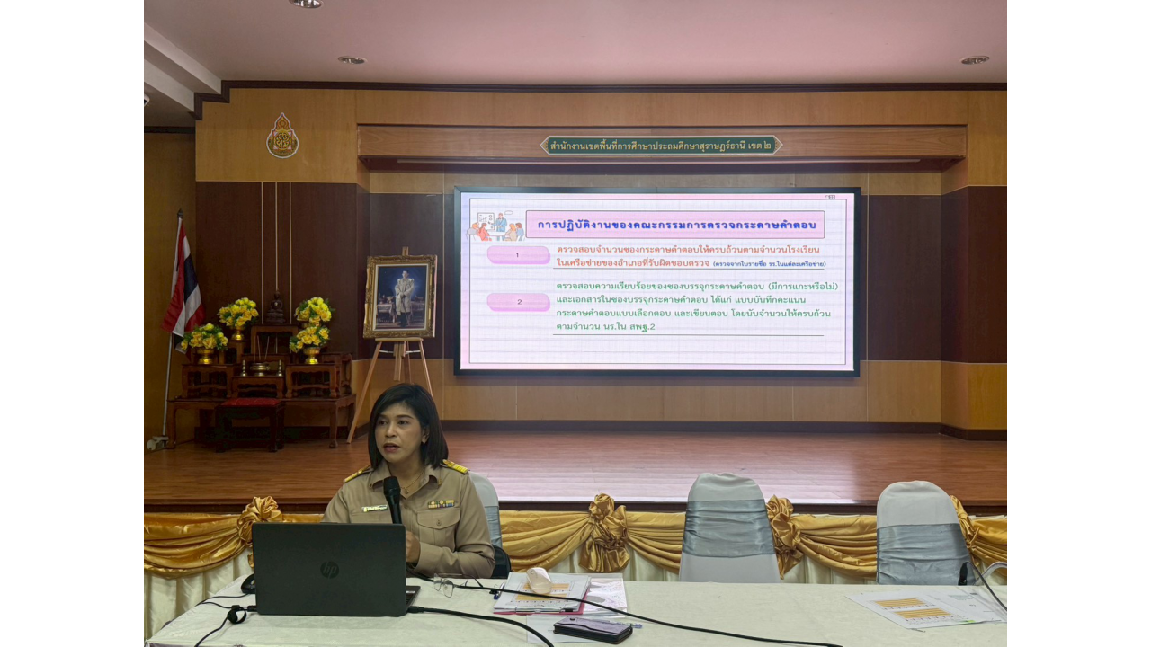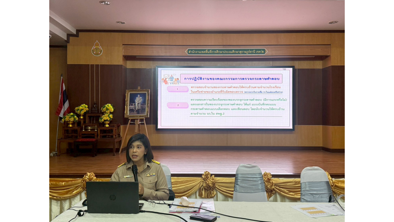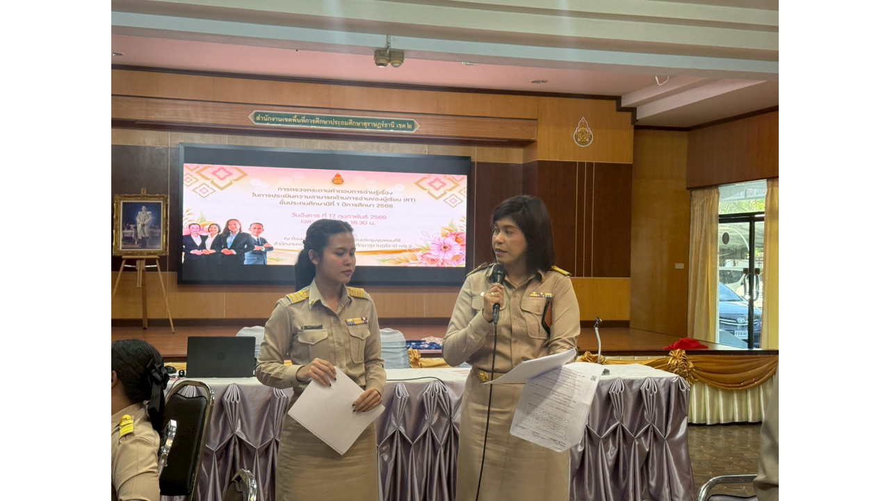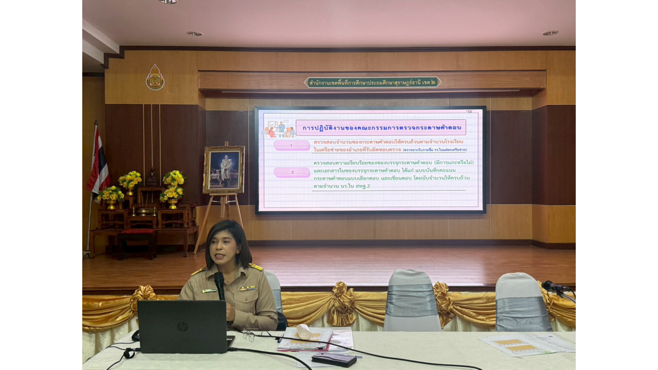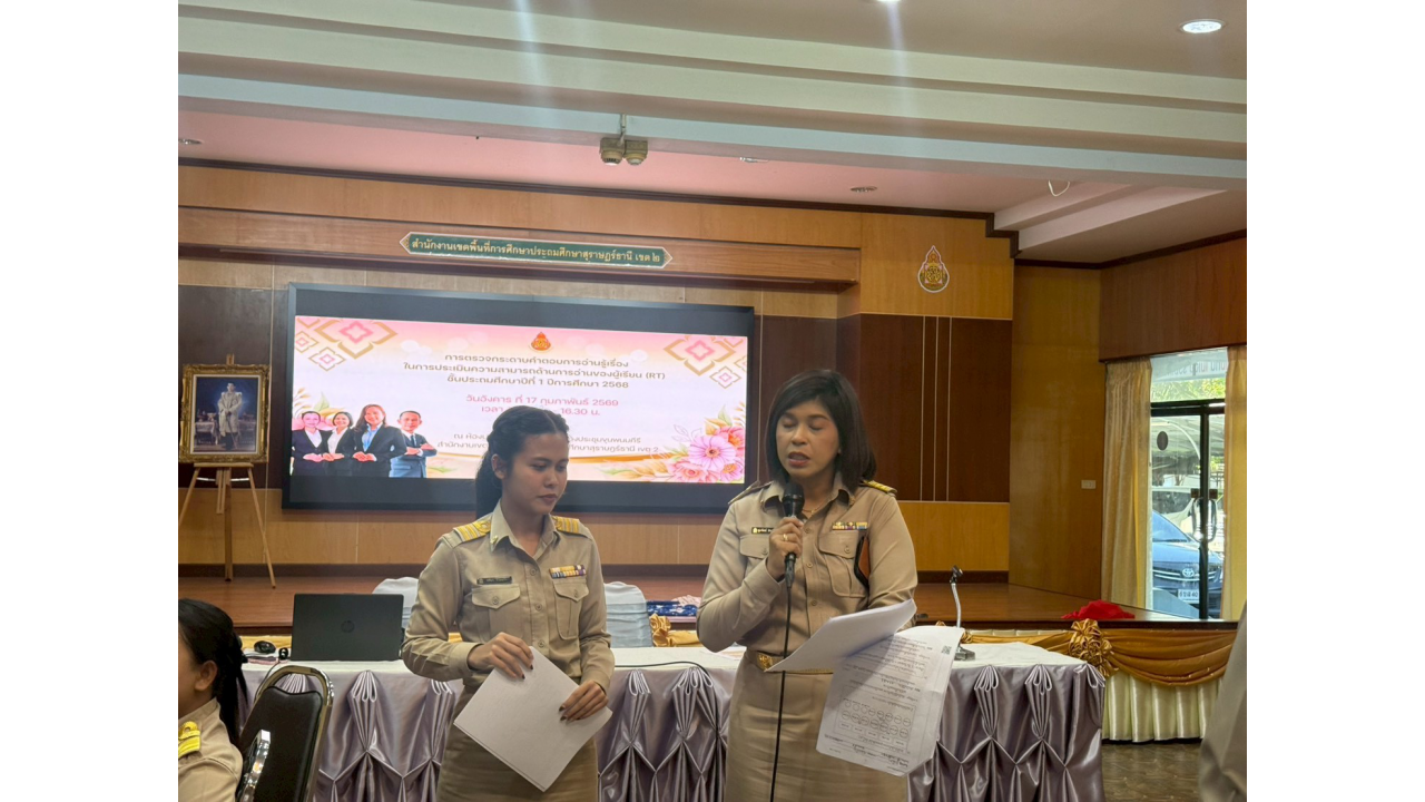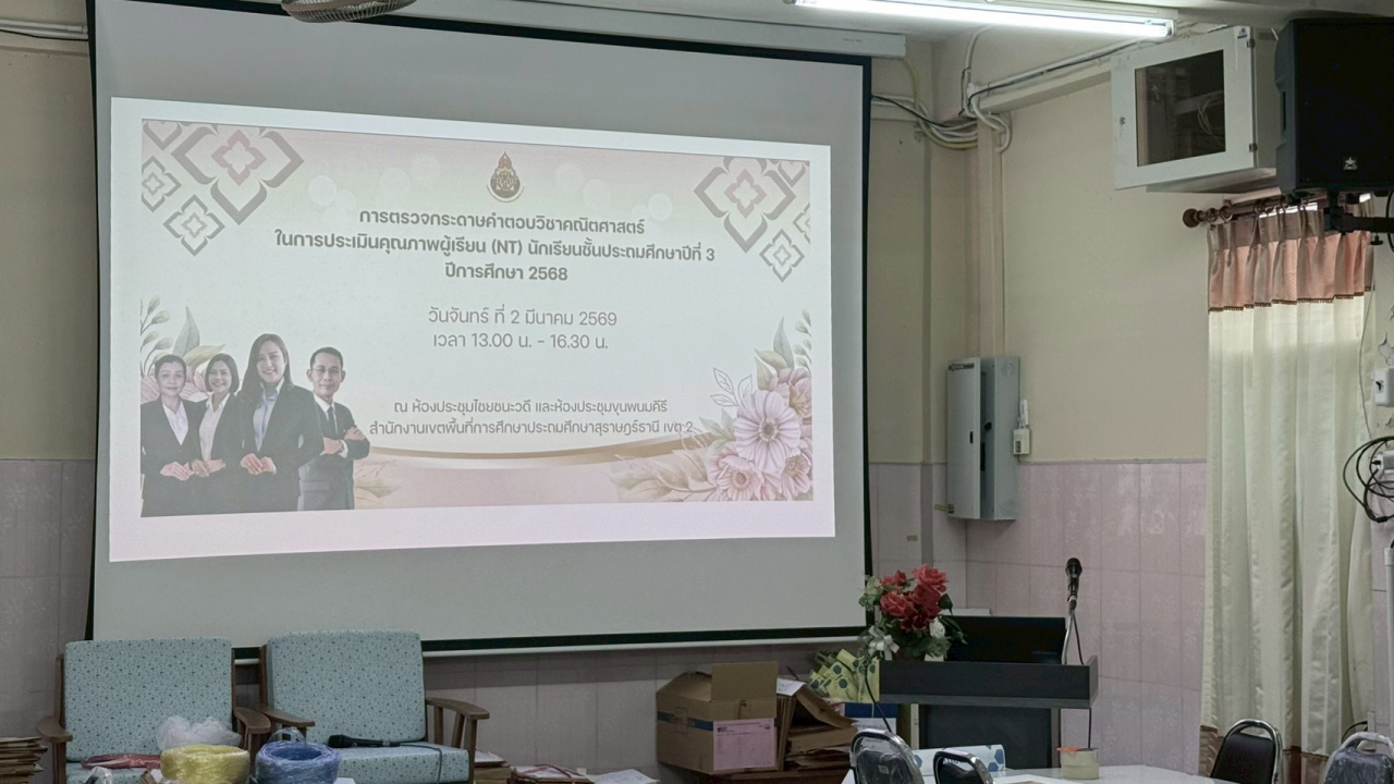 วันจันทร์ที่ 2 มีนาคม 2569 – นางสาวปวิชญา สินน้อย ผู้อำนวยการสำนักงานเขตพื้นที่การศึกษาประถมศึกษาสุราษฎร์ธานี เขต 2 เป็นประธานในการตรวจเยี่ยมและพบปะพูดคุยเพื่อสร้างขวัญและกำลังใจแก่คณะกรรมการในกิจกรรมตรวจกระดาษคำตอบ การประเมินคุณภาพผู้เรียน (NT) ชั้นประถมศึกษาปีที่ 3 ปีการศึกษา 2568 ณ สำนักงานเขตพื้นที่การศึกษาประถมศึกษาสุราษฎร์ธานี เขต 2