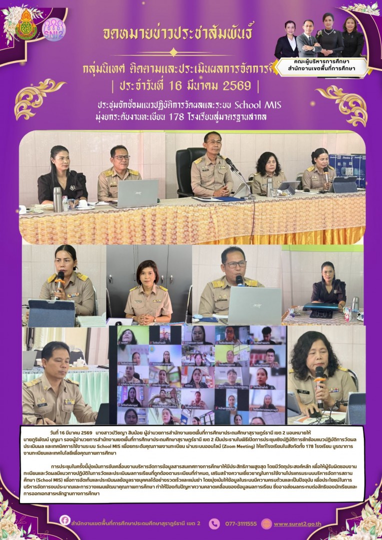วันจันทร์ที่ 16 มีนาคม 2569 – นางสาวปวิชญา สินน้อย ผู้อำนวยการสำนักงานเขตพื้นที่การศึกษาประถมศึกษาสุราษฎร์ธานี เขต 2 มอบหมายให้ นายภูริพัฒน์ บุญมา รองผู้อำนวยการสำนักงานเขตพื้นที่การศึกษาประถมศึกษาสุราษฎร์ธานี เขต 2 เป็นประธานในพิธีเปิดการประชุมเชิงปฏิบัติการซักซ้อมแนวปฏิบัติการวัดผลประเมินผล และเทคนิคการใช้งานระบบ School MIS เพื่อยกระดับคุณภาพงานทะเบียน ผ่านระบบออนไลน์ (Zoom Meeting) ให้แก่โรงเรียนในสังกัดทั้ง 178 โรงเรียนบูรณาการงานทะเบียนและเทคโนโลยีเพื่อคุณภาพการศึกษา