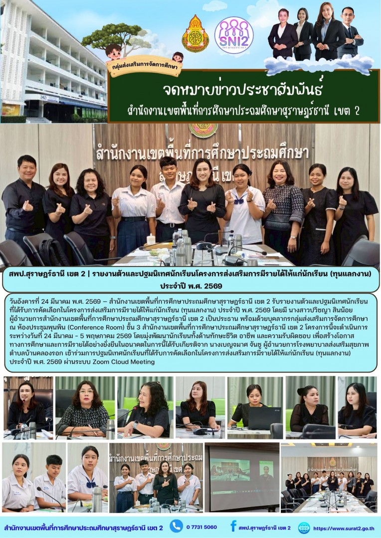 วันอังคารที่ 24 มีนาคม พ.ศ. 2569 — สำนักงานเขตพื้นที่การศึกษาประถมศึกษาสุราษฎร์ธานี เขต 2 รับรายงานตัวและปฐมนิเทศนักเรียนที่ได้รับการคัดเลือกในโครงการส่งเสริมการมีรายได้ให้แก่นักเรียน (ทุนแลกงาน) ประจำปี พ.ศ. 2569 โดยมี นางสาวปวิชญา สินน้อย ผู้อำนวยการสำนักงานเขตพื้นที่การศึกษาประถมศึกษาสุราษฎร์ธานี เขต 2 เป็นประธาน พร้อมด้วยบุคลากรกลุ่มส่งเสริมการจัดการศึกษา ณ ห้องประชุมพุนพิน (Conference Room) ชั้น 3 สำนักงานเขตพื้นที่การศึกษาประถมศึกษาสุราษฎร์ธานี เขต 2 โครงการนี้จะดำเนินการระหว่างวันที่ ๒๔ มีนาคม - 5 พฤษภาคม ๒๕๖๙ โดยมุ่งพัฒนานักเรียนทั้งด้านทักษะชีวิต อาชีพ และความรับผิดชอบ เพื่อสร้างโอกาสทางการศึกษาและการมีรายได้อย่างยั่งยืนในอนาคต