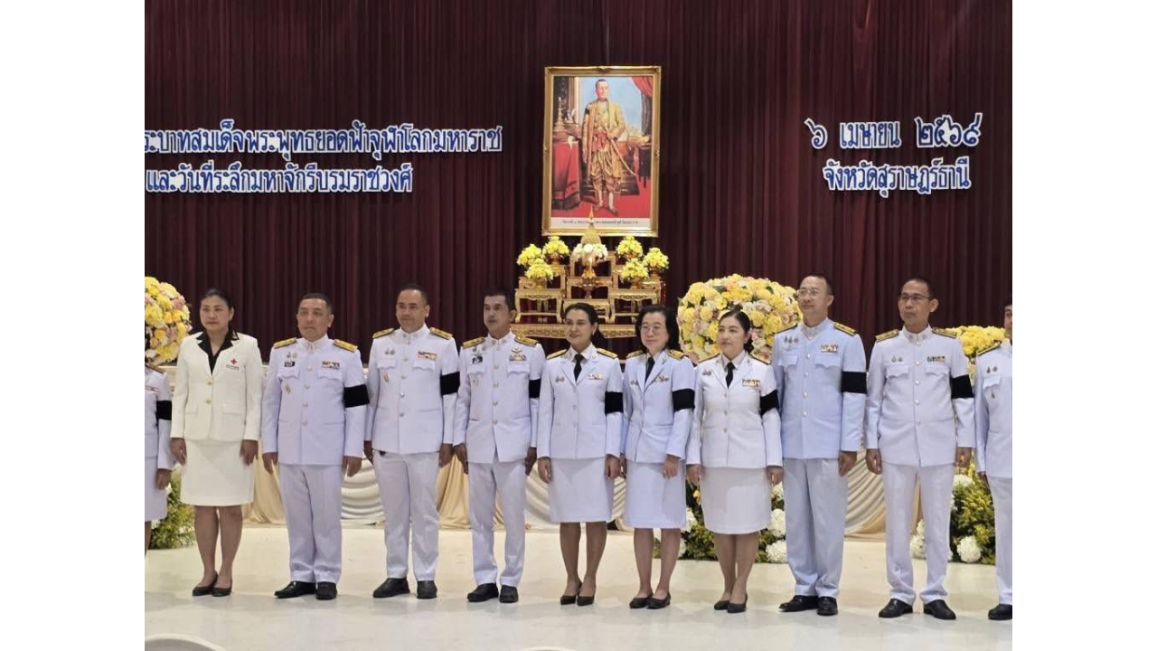 โดยมี นายจุมพฏ วรรณฉัตรสิริ ผู้ว่าราชการจังหวัดสุราษฎร์ธานี เป็นประธานในพิธีพิธีวางพานพุ่มดอกไม้ถวายราชสักการะ และกล่าวนำถวายอาศิรวาทราชสดุดีเฉลิมพระเกียรติ เนื่องใน “วันที่ระลึกพระบาทสมเด็จพระพุทธยอดฟ้าจุฬาโลกมหาราช และวันที่ระลึกมหาจักรีบรมราชวงศ์” ประจำปีพุทธศักราช 2569 ณ อาคารศูนย์กลางการประชุมสัมมนาภาคใต้ จังหวัดสุราษฎร์ธานี
