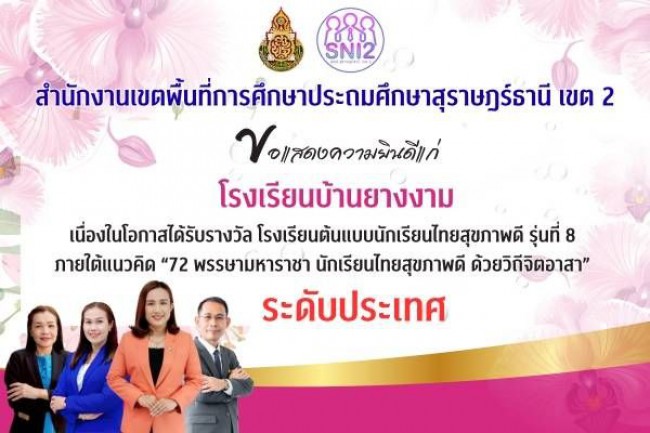 สำนักงานเขตพื้นที่การศึกษาประถมศึกษาสุราษฎร์ธานี เขต 2 🎉 ขอแสดงความยินดีอย่างยิ่งแก่ โรงเรียนบ้านยางงาม ในโอกาสได้รับรางวัลโรงเรียนต้นแบบนักเรียนไทยสุขภาพดี รุ่นที่ 8 ระดับประเทศ 🥳