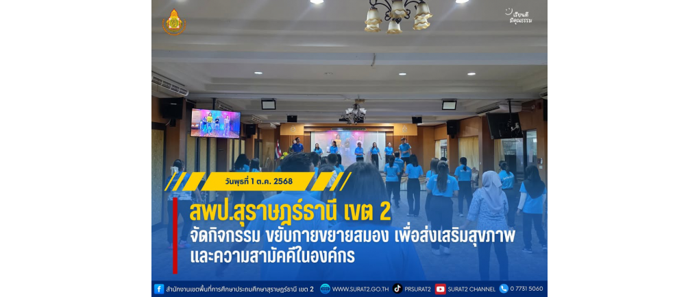สพป.สุราษฎร์ธานี เขต 2 จัดกิจกรรม ขยับกายขยายสมอง เพื่อส่งเสริมสุขภาพและความสามัคคีในองค์กร . วันพุธที่ 1 ตุลาคม พ.ศ. 2568 — สำนักงานเขตพื้นที่การศึกษาประถมศึกษาสุราษฎร์ธานี เขต 2 นำโดยนางสาวปวิชญา สินน้อย ผู้อำนวยการสำนักงานเขตพื้นที่การศึกษาประถมศึกษาสุราษฎร์ธานี เขต 2 และนายภูริพัฒน์ บุญมา รองผู้อำนวยการสำนักงานเขตพื้นที่ฯ พร้อมด้วยบุคลากรในสังกัด ร่วมกิจกรรม ขยับกายขยายสมอง ณ ห้องประชุมไชยชนะวดี สำนักงานเขตพื้นที่การศึกษาประถมศึกษาสุราษฎร์ธานี เขต 2 กิจกรรมดังกล่าวมีวัตถุประสงค์เพื่อส่งเสริมให้บุคลากรมีสุขภาพกายและสุขภาพจิตที่ดี ลดความเครียดจากการทำงาน และสร้างความสามัคคีในองค์กร เพื่อสร้างบรรยากาศการทำงานที่มีความสุข เกิดพลังในการขับเคลื่อนภารกิจของสำนักงานเขตพื้นที่การศึกษาอย่างมีประสิทธิภาพ