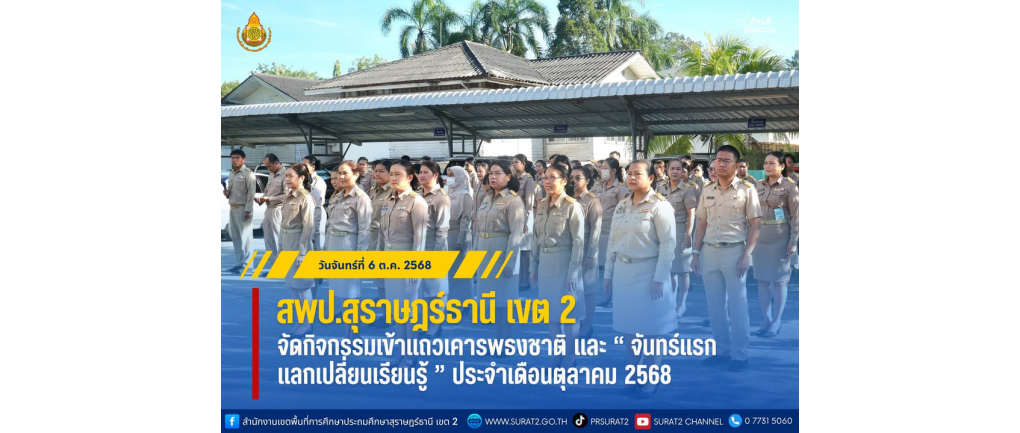 สพป.สุราษฎร์ธานี เขต 2 จัดกิจกรรมเข้าแถวเคารพธงชาติ และ “จันทร์แรก แลกเปลี่ยนเรียนรู้” ประจำเดือนตุลาคม 2568 . วันจันทร์ที่ 6 ตุลาคม พ.ศ. 2568 — นางสาวปวิชญา สินน้อย ผู้อำนวยการสำนักงานเขตพื้นที่การศึกษาประถมศึกษาสุราษฎร์ธานี เขต 2 นำบุคลากรในสังกัดร่วมกิจกรรมเข้าแถวเคารพธงชาติ สวดมนต์ไหว้พระ ณ บริเวณหน้าเสาธงสำนักงานเขตพื้นที่การศึกษาฯ โดยมีคณะผู้บริหาร ข้าราชการ และลูกจ้างเข้าพร้อมด้วย นักศึกษาฝึกปฏิบัติการบริหารการศึกษา เข้าร่วมอย่างพร้อมเพรียง ภายหลังเสร็จสิ้นกิจกรรม ผู้อำนวยการสำนักงานฯ ได้พบปะให้โอวาทแก่บุคลากร พร้อมรับฟังรายงานผลการดำเนินงานจากผู้อำนวยการกลุ่ม/หน่วยต่าง ๆ รวมถึงบุคลากรใน สพท. ร่วมแลกเปลี่ยนเรียนรู้ในกิจกรรม “จันทร์แรก แลกเปลี่ยนเรียนรู้” ณ ห้องประชุมไชยชนะวดี เพื่อร่วมกันขับเคลื่อนภารกิจของสำนักงานให้เป็นไปอย่างมีประสิทธิภาพและยั่งยืน