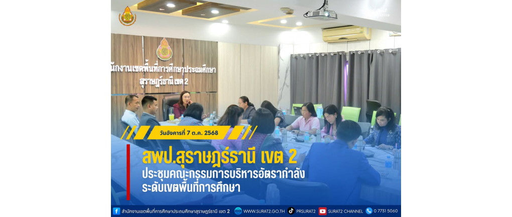 วันอังคารที่ 7 ตุลาคม พ.ศ. 2568 — นางสาวปวิชญา สินน้อย ผู้อำนวยการสำนักงานเขตพื้นที่การศึกษาประถมศึกษาสุราษฎร์ธานี เขต 2 เป็นประธานการประชุมคณะกรรมการบริหารอัตรากำลังระดับเขตพื้นที่การศึกษา ครั้งที่ 2/2568 พร้อมด้วยคณะกรรมการฯ ณ ห้องประชุมพุนพิน สำนักงานเขตพื้นที่การศึกษาประถมศึกษาสุราษฎร์ธานี เขต 2