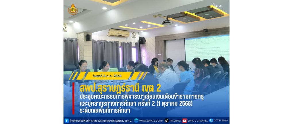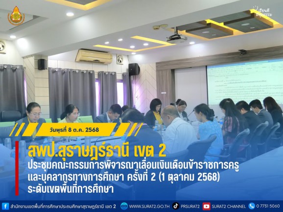 สพป.สุราษฎร์ธานี เขต 2 ประชุมคณะกรรมการพิจารณาเลื่อนเงินเดือนข้าราชการครูและบุคลากรทางการศึกษา ครั้งที่ 2 (1 ตุลาคม 2568) ระดับเขตพื้นที่การศึกษา . วันพุธที่ 8 ตุลาคม พ.ศ. 2568 — นางสาวปวิชญา สินน้อย ผู้อำนวยการสำนักงานเขตพื้นที่การศึกษาประถมศึกษาสุราษฎร์ธานี เขต 2 เป็นประธานการประชุมคณะกรรมการพิจารณาเลื่อนเงินเดือนข้าราชการครูและบุคลากรทางการศึกษา ครั้งที่ 2 (1 ตุลาคม 2568) ระดับเขตพื้นที่การศึกษา 2568 โดยมีคณะกรรมการเข้าร่วมประชุมเพื่อพิจารณาเลื่อนเงินเดือนตามหลักเกณฑ์และมาตรฐานที่กำหนด ณ ห้องประชุมพุนพิน สำนักงานเขตพื้นที่การศึกษาประถมศึกษาสุราษฎร์ธานี เขต 2