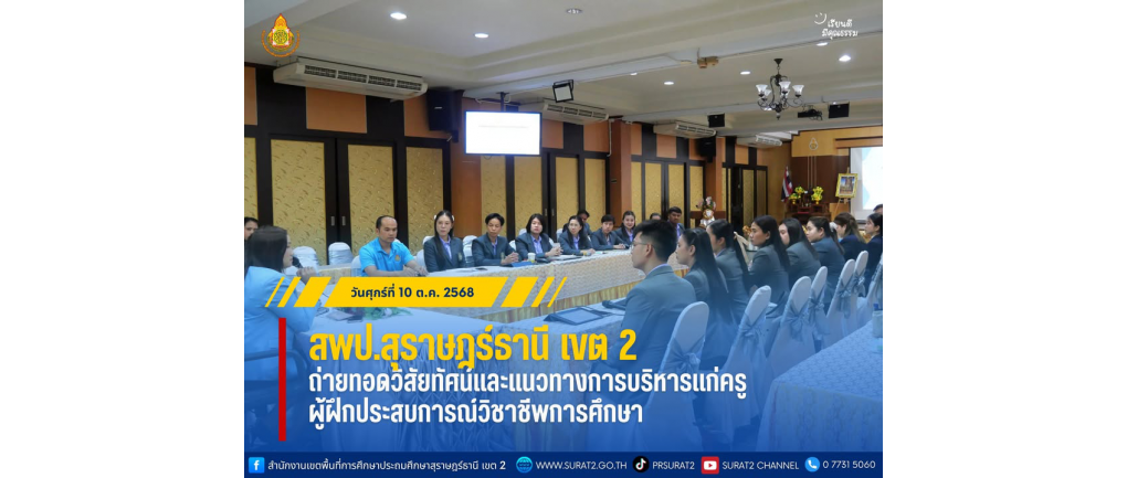 สพป.สุราษฎร์ธานี เขต 2 ถ่ายทอดวิสัยทัศน์และแนวทางการบริหารแก่ครูผู้ฝึกประสบการณ์วิชาชีพด้านการบริหารการศึกษา . วันศุกร์ที่ 10 ตุลาคม 2568 — นางสาวปวิชญา สินน้อย ผู้อำนวยการสำนักงานเขตพื้นที่การศึกษาประถมศึกษาสุราษฎร์ธานี เขต 2 พร้อมด้วย นางธัญกาญจน์ ภาสตโรจน์ รองผู้อำนวยการสำนักงานเขตพื้นที่ฯ ร่วมพบปะและถ่ายทอดวิสัยทัศน์ด้านการบริหารการศึกษา พร้อมทั้งให้แนวทางการปฏิบัติงานแก่นักศึกษาฝึกประสบการณ์วิชาชีพด้านการบริหารการศึกษา ระดับศึกษาศาสตรมหาบัณฑิต สาขาวิชาการบริหารการศึกษา จากมหาวิทยาลัยราชภัฏสุราษฎร์ธานี มหาวิทยาลัยกรุงเทพธนบุรี มหาวิทยาลัยปทุมธานี และมหาวิทยาลัยเวสเทิร์น รวมจำนวนทั้งสิ้น 30 คน ภายหลัง นางสงวนรัตน์ คงนุ่ม รองผู้อำนวยการสำนักงานเขตพื้นที่การศึกษาประถมศึกษาประถมศึกษาสุราษฎร์ธานี เขต 2 พร้อมด้วยบุคลากรกลุ่มส่งเสริมการจัดการศึกษา ได้ร่วมดำเนินกิจกรรมตามแผนการฝึกปฏิบัติวิชาชีพการบริหารการศึกษา โดยบรรยายให้ความรู้เกี่ยวกับภารกิจ บทบาทหน้าที่ และกระบวนการดำเนินงานของสำนักงาน เพื่อเสริมสร้างประสบการณ์ตรงและความเข้าใจในบทบาทของผู้บริหารทางการศึกษาอย่างรอบด้าน ณ ห้องประชุมไชยชนะวดี สำนักงานเขตพื้นที่การศึกษาประถมศึกษาสุราษฎร์ธานี เขต 2