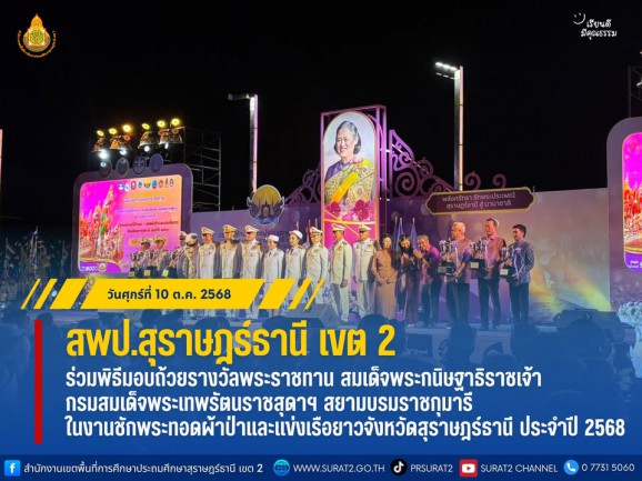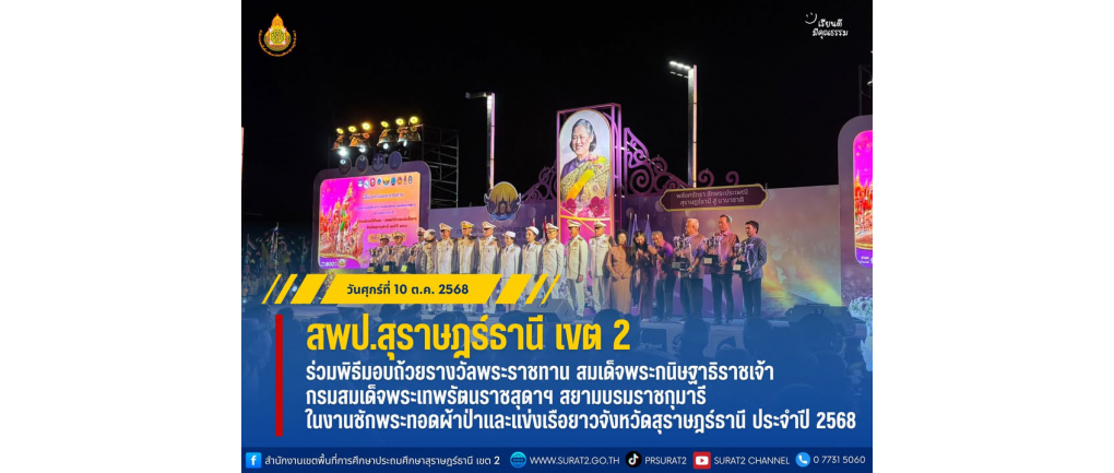 สพป.สุราษฎร์ธานี เขต 2 ร่วมพิธีมอบถ้วยรางวัลพระราชทาน สมเด็จพระกนิษฐาธิราชเจ้า กรมสมเด็จพระเทพรัตนราชสุดาฯ สยามบรมราชกุมารี ในงานชักพระ ทอดผ้าป่าและแข่งเรือยาวจังหวัดสุราษฎร์ธานี ประจำปี 2568 . เมื่อวันศุกร์ 10 ตุลาคม พ.ศ. 2568 เวลา 19.30 น.— นางสาวปวิชญา สินน้อย ผู้อำนวยการสำนักงานเขตพื้นที่การศึกษาประถมศึกษาสุราษฎร์ธานี เขต 2 ร่วมพิธีมอบถ้วยรางวัลพระราชทาน สมเด็จพระกนิษฐาธิราชเจ้า กรมสมเด็จพระเทพรัตนราชสุดาฯ สยามบรมราชกุมารี ในงานชักพระทอด ผ้าป่าและแข่งเรือยาวจังหวัดสุราษฎร์ธานี ประจำปี 2568 โดยมีนายธีรุตม์ ศุภวิบูลย์ผล ผู้ว่าราชการจังหวัดสุราษฎร์ธานี เป็นประธานในพิธีฯ ณ บริเวณสะพานนริศ ริมเขื่อนแม่น้ำตาปี อำเภอเมืองสุราษฎร์ธานี จังหวัดสุราษฎร์ธานี . ภาพ : ศรัณย์รัชต์ รัตนสมบัติ