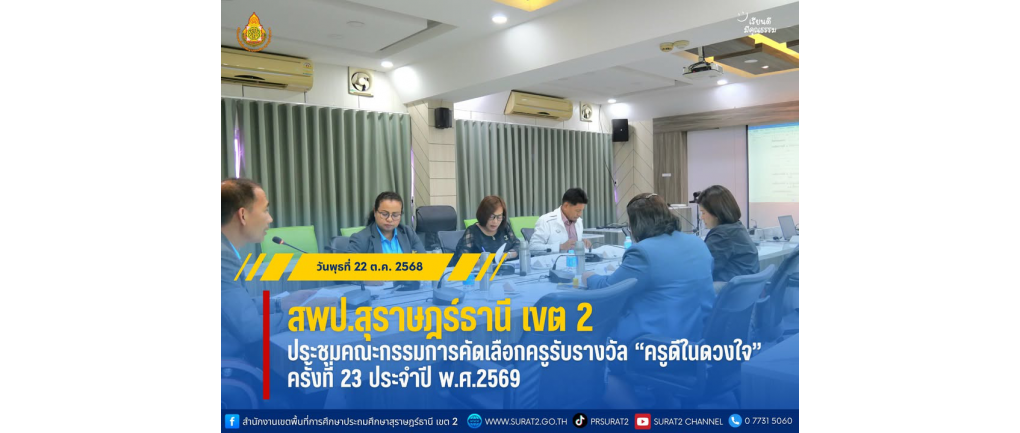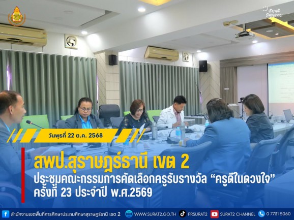 สพป.สุราษฎร์ธานี เขต 2 ประชุมคณะกรรมการคัดเลือกครูรับรางวัล “ครูดีในดวงใจ”ครั้งที่ 23 ประจำปี พ.ศ.2569 . วันพุธที่ 22 ตุลาคม พ.ศ. 2568 — สพป.สุราษฎร์ธานี เขต 2 ประชุมคณะกรรมการคัดเลือกครูรับรางวัล “ครูดีในดวงใจ” ครั้งที่ 23 ประจำปี พ.ศ.2569 โดยมีคณะกรรมการฯ เข้าร่วมประชุม ณ ห้องประชุมพุนพิน สำนักงานเขตพื้นที่การศึกษาประถมศึกษาสุราษฎร์ธานี เขต 2
