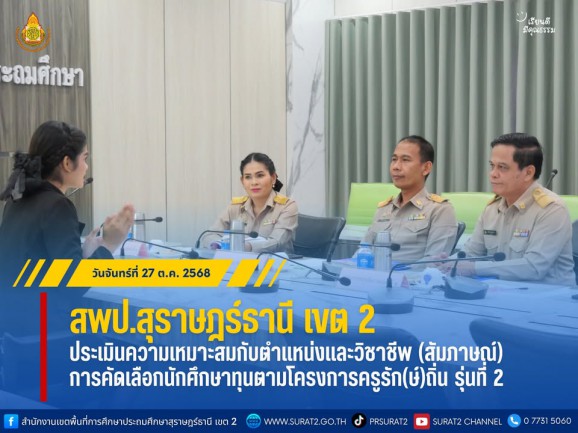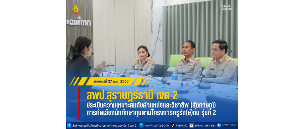สพป.สุราษฎร์ธานี เขต 2 ประเมินความเหมาะสมกับตำแหน่งและวิชาชีพ (สัมภาษณ์) การคัดเลือกนักศึกษาทุนตามโครงการครูรัก(ษ์)ถิ่น รุ่นที่ 2 . วันจันทร์ที่ 27 ตุลาคม พ.ศ. 2568 — สพป.สุราษฎร์ธานี เขต 2 ประเมินความเหมาะสมกับตำแหน่งและวิชาชีพ (สัมภาษณ์) การคัดเลือกนักศึกษาทุนตามโครงการครูรัก(ษ์)ถิ่น รุ่นที่ 2 เพื่อบรรจุแต่งตั้งเข้ารับราชการเป็นข้าราชการครูและบุคลากรทางการศึกษา ตำแหน่งครูผู้ช่วย สังกัดสำนักงานเขตพื้นที่การศึกษาประถมศึกษาสุราษฎร์ธานี เขต 2 ณ ห้องประชุมพุนพิน สำนักงานเขตพื้นที่การศึกษาประถมศึกษาสุราษฎร์ธานี เขต 2