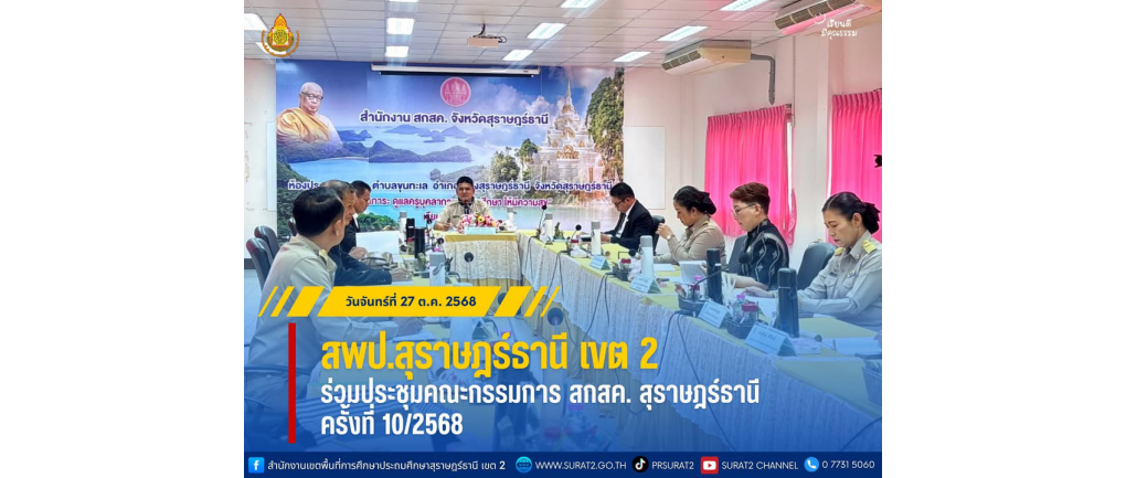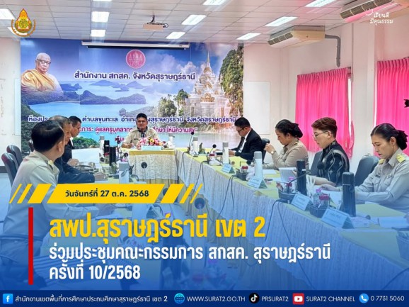 สพป.สุราษฎร์ธานี เขต 2 ร่วมประชุมคณะกรรมการ สกสค. สุราษฎร์ธานี ครั้งที่ 10/2568 . วันจันทร์ที่ 27 ตุลาคม พ.ศ. 2568 — นางสาวปวิชญา สินน้อย ผู้อำนวยการสำนักงานเขตพื้นที่การศึกษาประถมศึกษาสุราษฎร์ธานี เขต 2 ร่วมประชุมคณะกรรมการ สกสค. สุราษฎร์ธานี ครั้งที่ 10/2568 โดยมีนายโชคดี ศรัทธากาล ศึกษาธิการจังหวัดสุราษฎร์ธานี เป็นประธานการประชุมฯ ณ ห้องประชุมขุนทะเล สำนักงาน สกสค. จังหวัดสุราษฎร์ธานี ต.ขุนทะเล อ.เมือง จ.สุราษฎร์ธานี . 📸 ภาพ : ศรัณย์รัชต์ รัตนสมบัติ