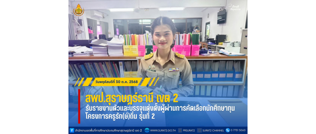 สพป.สุราษฎร์ธานี เขต 2 รับรายงานตัวบรรจุและแต่งตั้งผู้ผ่านการคัดเลือกนักศึกษาทุนโครงการครูรัก(ษ์)ถิ่น รุ่นที่ 2 . วันพฤหัสบดีที่ 30 ตุลาคม พ.ศ. 2568 — สำนักงานเขตพื้นที่การศึกษาประถมศึกษาสุราษฎร์ธานี เขต 2 ดำเนินการรับรายงานตัวและบรรจุแต่งตั้งผู้ผ่านการคัดเลือกนักศึกษาทุนตามโครงการครูรัก(ษ์)ถิ่น รุ่นที่ 2 เพื่อเข้ารับราชการเป็นข้าราชการครูและบุคลากรทางการศึกษา ตำแหน่งครูผู้ช่วย โรงเรียนบ้านขวัญพัฒน์ สังกัดสำนักงานเขตพื้นที่การศึกษาประถมศึกษาสุราษฎร์ธานี เขต 2 โดยมีนางสาวธัญญลักษณ์ นวลออง นักทรัพยากรบุคคลปฏิบัติการ เป็นผู้ดำเนินการรับรายงานตัว ณ สพป.สุราษฎร์ธานี เขต 2
