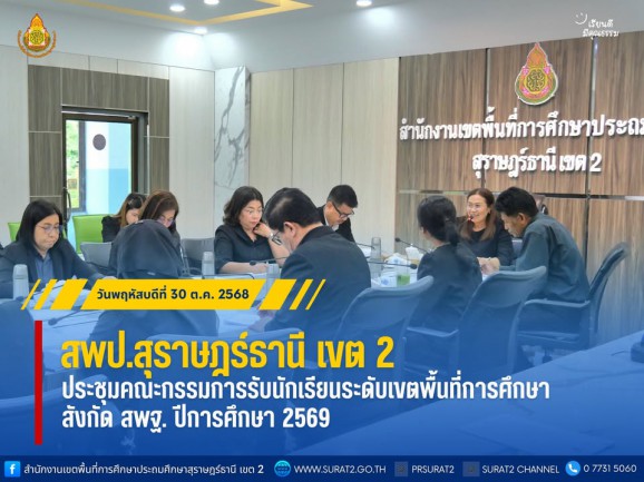 สพป.สุราษฎร์ธานี เขต 2 ประชุมคณะกรรมการรับนักเรียนระดับเขตพื้นที่การศึกษา สังกัด สพฐ. ปีการศึกษา 2569 . วันพฤหัสบดีที่ 30 ตุลาคม พ.ศ. 2568 — นางสาวปวิชญา สินน้อย ผู้อำนวยการสำนักงานเขตพื้นที่การศึกษาประถมศึกษาสุราษฎร์ธานี เขต 2 มอบหมายให้นางสงวนรัตน์ คงนุ่ม รองผู้อำนวยการสำนักงานเขตพื้นที่ฯ เป็นประธานในการประชุม คณะกรรมการรับนักเรียนระดับเขตพื้นที่การศึกษา สังกัดสำนักงานคณะกรรมการการศึกษาขั้นพื้นฐาน (สพฐ.) ปีการศึกษา 2569 ของสำนักงานเขตพื้นที่การศึกษาประถมศึกษาสุราษฎร์ธานี เขต 2 ครั้งที่ 1/2568 การประชุมครั้งนี้จัดขึ้นเพื่อเตรียมความพร้อมและกำหนดแนวทางการดำเนินงานรับนักเรียนในสังกัดให้เป็นไปตามนโยบายของ สพฐ. และสอดคล้องกับบริบทของพื้นที่ โดยมีคณะกรรมการฯ เข้าร่วมประชุมอย่างพร้อมเพรียง ณ ห้องประชุมพุนพิน สำนักงานเขตพื้นที่การศึกษาประถมศึกษาสุราษฎร์ธานี เขต 2