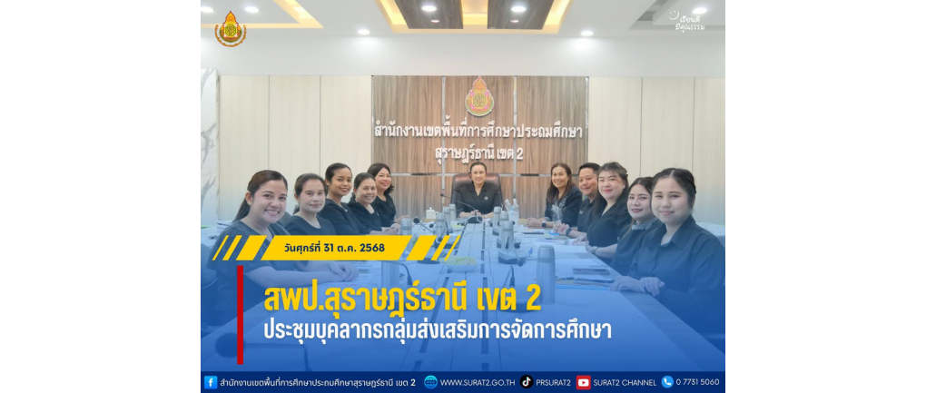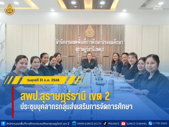 สพป.สุราษฎร์ธานี เขต 2 ประชุมบุคลากรกลุ่มส่งเสริมการจัดการศึกษา . วันศุกร์ที่ 31 ตุลาคม พ.ศ. 2568 — นางสาวปวิชญา สินน้อย ผู้อำนวยการสำนักงานเขตพื้นที่การศึกษาประถมศึกษาสุราษฎร์ธานี เขต 2 เป็นประธานในการประชุมบุคลากรกลุ่มส่งเสริมการจัดการศึกษา เพื่อติดตามการดำเนินงานและแลกเปลี่ยนเรียนรู้งานของกลุ่มฯ โดยมี นางสงวนรัตน์ คงนุ่ม รองผู้อำนวยการสำนักงานเขตพื้นที่ฯ พร้อมด้วยบุคลากรกลุ่มส่งเสริมการจัดการศึกษา เข้าร่วมประชุม ณ ห้องประชุมพุนพิน สำนักงานเขตพื้นที่การศึกษาประถมศึกษาสุราษฎร์ธานี เขต 2