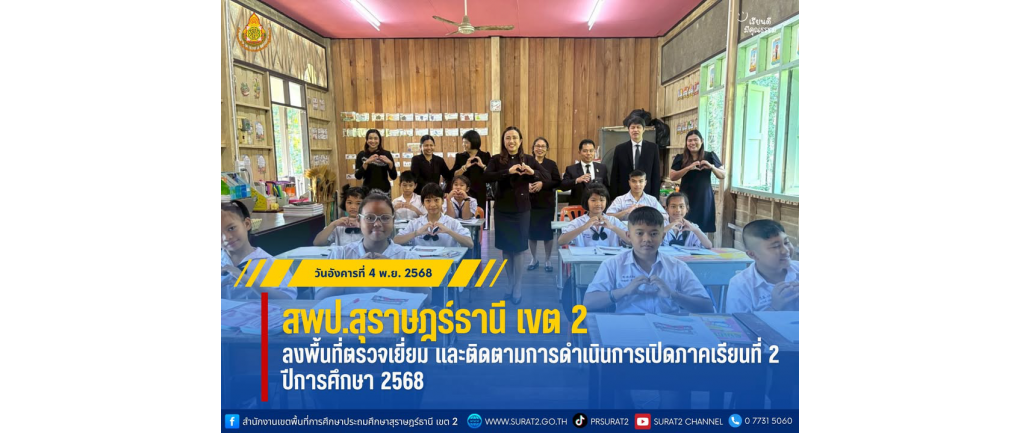 สพป.สุราษฎร์ธานี เขต 2 ลงพื้นที่ตรวจเยี่ยม ติดตามการดำเนินการเปิดภาคเรียนที่ 2 ปีการศึกษา 2568 . วันอังคารที่ 4 พฤศจิกายน พ.ศ. 2568 — สำนักงานเขตพื้นที่การศึกษาประถมศึกษาสุราษฎร์ธานี เขต 2 นำโดย นางสาวปวิชญา สินน้อย ผู้อำนวยการสำนักงานเขตพื้นที่การศึกษาประถมศึกษาประถมศึกษาสุราษฎร์ธานี เขต 2 พร้อมด้วยคณะประกอบด้วย 1. นางสาวพัฒนา อาชาชาญ ผู้อำนวยการหน่วยตรวจสอบภายใน 2. นายภานุพงค์ เวชวิทยาอำไพกิจ ผู้อำนวยการกลุ่มกฏหมายและคดี 3. นางสาวกิตติยา ชูช่วย ผู้อำนวยการกลุ่มอำนวยการ 4. นางสาวศุภรัตน์ อินทรสุวรรณ ผู้อำนวยการกลุ่มนิเทศ ติดตาม และประเมินผลการจัดการศึกษา 5. นายสุวัฒน์ อนุพัฒน์ ศึกษานิเทศก์ ลงพื้นที่ตรวจเยี่ยมและติดตามการดำเนินการเปิดภาคเรียนที่ 2 ปีการศึกษา 2568 ของโรงเรียนในสังกัดสำนักงานเขตพื้นที่การศึกษาประถมศึกษาสุราษฎร์ธานี เขต 2 อำเภอไชยา ได้แก่ โรงเรียนวัดธารน้ำไหล โรงเรียนสารภีอุทิศ และโรงเรียนบ้านตะกรบ ในการนี้ นางสาวปวิชญา สินน้อย และคณะ ได้ติดตามการดำเนินงานตามนโยบายและจุดเน้นของสำนักงานคณะกรรมการการศึกษาขั้นพื้นฐาน พร้อมทั้งให้กำลังใจผู้บริหารสถานศึกษา คณะครู และบุคลากรทางการศึกษา ในการจัดการเรียนการสอนให้เป็นไปอย่างมีประสิทธิภาพและเกิดประโยชน์สูงสุดต่อผู้เรียน