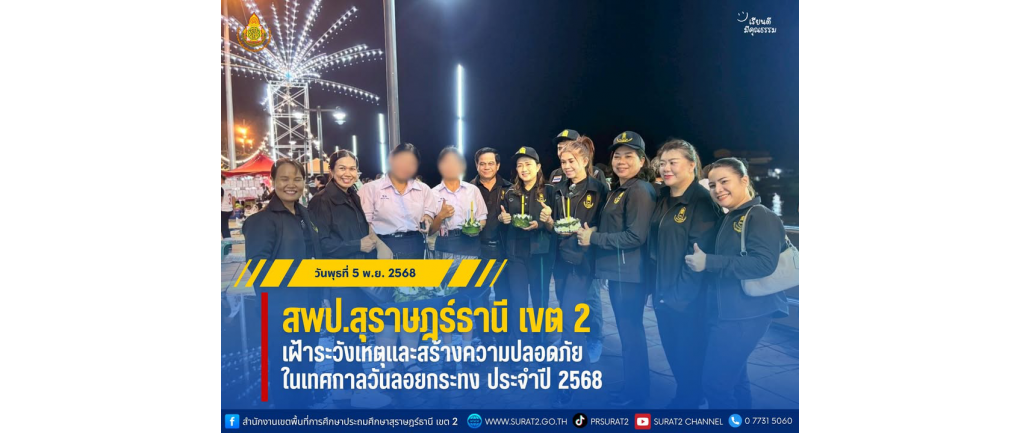 สพป.สุราษฎร์ธานี เขต 2 เฝ้าระวังเหตุและสร้างความปลอดภัยในเทศกาลวันลอยกระทง ประจำปี 2568 . วันพุธที่ 5 พฤศจิกายน พ.ศ. 2568 — นางสาวปวิชญา สินน้อย ผู้อำนวยการสำนักงานเขตพื้นที่การศึกษาประถมศึกษาสุราษฎร์ธานี เขต 2 พร้อมด้วย นางสงวนรัตน์ คงนุ่ม รองผู้อำนวยการสำนักงานเขตพื้นที่การศึกษาประถมศึกษาสุราษฎร์ธานี เขต 2 ผู้บริหารสถานศึกษาในอำเภอพุนพิน และพนักงานเจ้าหน้าที่ส่งเสริมความประพฤตินักเรียนและนักศึกษา (พสน.) ลงพื้นที่เฝ้าระวังเหตุและสร้างความปลอดภัยในช่วงเทศกาลวันลอยกระทง ประจำปี 2568 ในพื้นที่อำเภอพุนพิน จังหวัดสุราษฎร์ธานี โดยออกตรวจตามจุดสำคัญต่าง ๆ ได้แก่ ท่าน้ำวัดรัตนธรรมาราม (ท่าล้อน) ท่าน้ำเขาหัวควาย ท่าน้ำตลาดสดเทศบาลเมืองท่าข้าม รวมทั้งโรงแรมและรีสอร์ทในพื้นที่ เพื่อคุ้มครอง ดูแล และให้ความช่วยเหลือเด็กนักเรียน ตลอดจนเฝ้าระวังป้องกันเหตุไม่พึงประสงค์ที่อาจเกิดขึ้นในช่วงเทศกาล
