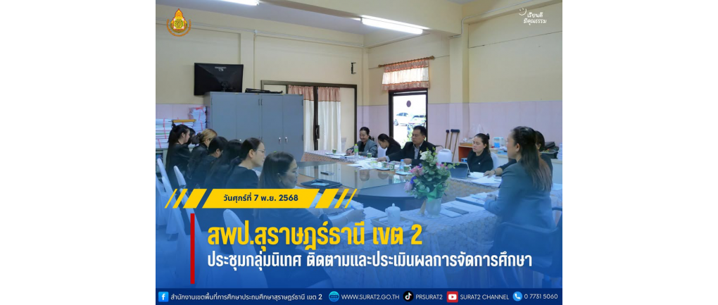 สพป.สุราษฎร์ธานี เขต 2 ประชุมกลุ่มนิเทศ ติดตามและประเมินผลการจัดการศึกษา . วันศุกร์ที่ 7 พฤศจิกายน พ.ศ. 2568 — นางสาวปวิชญา สินน้อย ผู้อำนวยการสำนักงานเขตพื้นที่การศึกษาประถมศึกษาสุราษฎร์ธานี เขต 2 เป็นประธานในการประชุมกลุ่มนิเทศ ติดตามและประเมินผลการจัดการศึกษา สพป.สุราษฎร์ธานี เขต 2 เพื่อติดตามการดำเนินงานและแลกเปลี่ยนเรียนรู้งานของกลุ่มฯ โดยมีนางสงวนรัตน์ คงนุ่ม รองผู้อำนวยการสำนักงานเขตพื้นที่ฯ พร้อมด้วยบุคลากรกลุ่มนิเทศ ติดตามและประเมินผลการจัดการศึกษาเข้าร่วมประชุม ณ ห้องประชุม สำนักงานเขตพื้นที่การศึกษาประถมศึกษาสุราษฎร์ธานี เขต 2