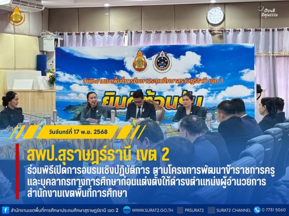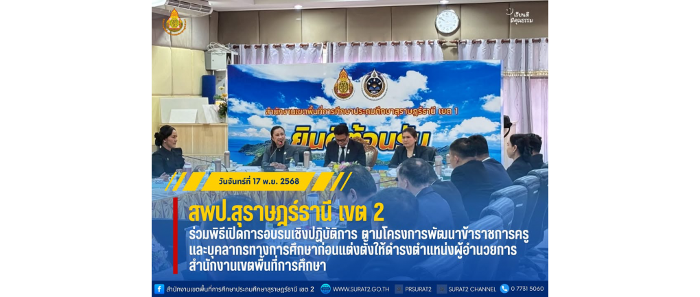 วันจันทร์ที่ 17 พฤศจิกายน พ.ศ. 2568 — นางสาวปวิชญา สินน้อย ผู้อำนวยการสำนักงานเขตพื้นที่การศึกษาประถมศึกษาสุราษฎร์ธานี เขต 2 ร่วมพิธีเปิดการอบรมเชิงปฏิบัติการ ตามโครงการพัฒนาข้าราชการครู และบุคลากรทางการศึกษาก่อนแต่งตั้งให้ดำรงตำแหน่งผู้อำนวยการสำนักงานเขตพื้นที่การศึกษา ณ ห้องประชุมเมืองคนดี สำนักงานเขตพื้นที่การศึกษาประถมศึกษาสุราษฎร์ธานี เขต 1 อำเภอเมืองสุราษฎร์ธานี จังหวัดสุราษฎร์ธานี