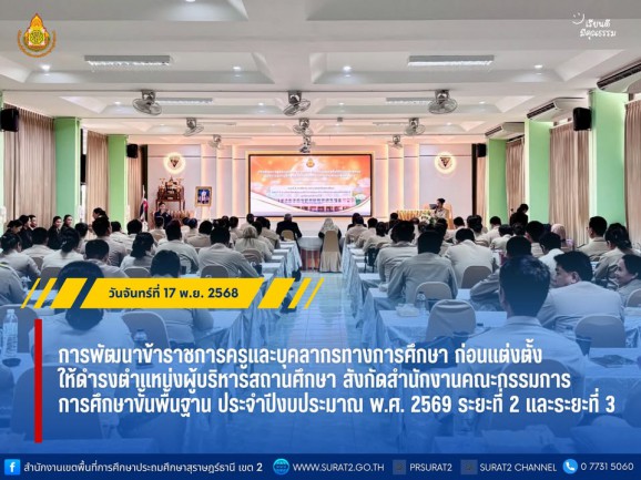 วันจันทร์ที่ 17 พฤศจิกายน พ.ศ. 2568 — นางสาวปวิชญา สินน้อย ผู้อำนวยการสำนักงานเขตพื้นที่การศึกษาประถมศึกษาสุราษฎร์ธานี เขต 2 ร่วมเป็นคณะวิทยากร/พี่เลี้ยง ตามโครงการพัฒนาข้าราชการครูและบุคลากรทางการศึกษา ก่อนแต่งตั้งให้ดำรงตำแหน่งผู้บริหารสถานศึกษา สังกัดสำนักงานคณะกรรมการการศึกษาขั้นพื้นฐาน ประจำปีงบประมาณ พ.ศ. 2569 ระยะที่ 2 และระยะที่ 3 ของเขตตรวจราชการที่ 5