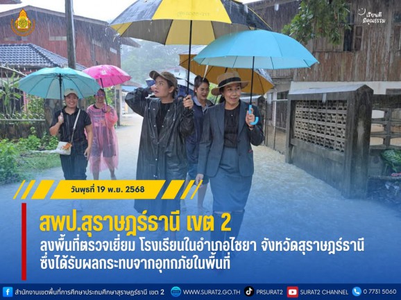 วันจันทร์ที่ 17 พฤศจิกายน พ.ศ. 2568 — นางสาวปวิชญา สินน้อย ผู้อำนวยการสำนักงานเขตพื้นที่การศึกษาประถมศึกษาสุราษฎร์ธานี เขต 2 มอบหมายให้ นางสงวนรัตน์ คงนุ่ม และนางธัญกาญจน์ ภาสตโรจน์ รองผู้อำนวยการสำนักงานเขตการศึกษาฯ พร้อมด้วยบุคลากรที่เกี่ยวข้อง ลงพื้นที่ตรวจเยี่ยม โรงเรียนสารภีอุทิศ โรงเรียนวัดชยาราม โรงเรียนบ้านหนองมน และโรงเรียนวัดไตรรัตนากร อำเภอไชยา จังหวัดสุราษฎร์ธานี ซึ่งได้รับผลกระทบจากอุทกภัยในพื้นที่