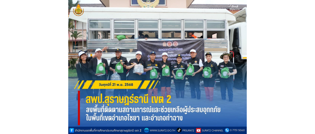 สพป.สุราษฎร์ธานี เขต ลงพื้นที่ติดตามสถานการณ์และช่วยเหลือผู้ประสบอุทกภัย ในพื้นที่เขตอำเภอไชยา และอำเภอท่าฉาง . วันศุกร์ที่ 21 พฤศจิกายน พ.ศ. 2568 — นางสาวปวิชญา สินน้อย ผู้อำนวยการสำนักงานเขตพื้นที่การศึกษาประถมศึกษาสุราษฎร์ธานี เขต 2 พร้อมด้วยนางสงวนรัตน์ คงนุ่ม และนางธัญกาญจน์ ภาสตโรจน์ รองผู้อำนวยการสำนักงานเขตพื้นที่ฯ รวมทั้งบุคลากรในสังกัดและผู้บริหารสถานศึกษา ได้ร่วมให้การต้อนรับคณะผู้แทนกระทรวงศึกษาธิการ และลงพื้นที่ติดตามสถานการณ์และช่วยเหลือผู้ประสบอุทกภัย ในพื้นที่เขตอำเภอไชยา และอำเภอท่าฉาง จังหวัดสุราษฎร์ธานีอย่างพร้อมเพรียง การลงพื้นที่ครั้งนี้นำโดย นางสาวอนงค์นาถ จ่าแก้ว เลขาธิการรัฐมนตรีว่าการกระทรวงศึกษาธิการ ว่าที่ร้อยตรี ดร.ธนุ วงษ์จินดา ข้าราชการการเมืองประจำสำนักเลขาธิการนายกรัฐมนตรี และโฆษกกระทรวงศึกษาธิการ และดร.ตฤณ ก้านดอกไม้ ผู้อำนวยการศูนย์บริหารความสุขและความปลอดภัย สพฐ. พร้อมคณะลงพื้นที่ติดตามสถานการณ์น้ำท่วม ส่งมอบความช่วยเหลือ มอบถุงยังชีพ และให้กำลังใจแก่ผู้ประสบอุทกภัยในพื้นที่ ดังนี้ • ที่ว่าการอำเภอไชยา • โรงเรียนเสวียดวิทยา รัชมังคลาภิเษก • โรงเรียนวัดพระบรมธาตุไชยา • โรงเรียนบ้านคชาธาร • โรงเรียนวัดบ่อมะปริง สพป.สุราษฎร์ธานี เขต 2 ขอแสดงความความห่วงใยต่อสถานศึกษา ครู บุคลากร และนักเรียนทุกคนในพื้นที่ พร้อมส่งกำลังใจและพร้อมประสานทุกภาคส่วนเพื่อให้ความช่วยเหลืออย่างเต็มกำลัง เพื่อให้ทุกโรงเรียนสามารถกลับมาดำเนินการเรียนการสอนตามปกติได้โดยเร็วที่สุด . ภาพเพิ่มเติม : https://drive.google.com/drive/folders/1L73Io3_h4WkJnLFM7S-GkrwWOFqFXnSU