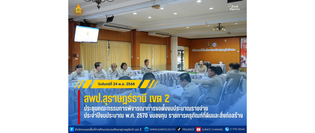 สพป.สุราษฎร์ธานี เขต 2 ประชุมคณะกรรมการพิจารณาการขอตั้งงบประมาณรายจ่าย ประจำปีงบประมาณ พ.ศ. 2570 งบลงทุน รายการครุภัณฑ์ที่ดินและสิ่งก่อสร้าง . วันจันทร์ที่ 24 พฤศจิกายน พ.ศ. 2568 — นางสาวปวิชญา สินน้อย ผู้อำนวยการสำนักงานเขตพื้นที่การศึกษาประถมศึกษาสุราษฎร์ธานี เขต 2 พร้อมด้วยนายภูริพัฒน์ บุญมา และนางสงวนรัตน์ คงนุ่ม รองผู้อำนวยการสำนักงานเขตพื้นที่การศึกษาประถมศึกษาสุราษฎร์ธานี เขต 2 และนางณปภัช ชูประเสริฐ ผู้อำนวยการกลุ่มนโยบายและแผน รวมทั้งบุคลากรที่เกี่ยวข้อง ร่วมประชุมคณะกรรมการพิจารณาการขอตั้งงบประมาณรายจ่าย ประจำปีงบประมาณ พ.ศ. 2570 งบลงทุน รายการครุภัณฑ์ที่ดินและสิ่งก่อสร้าง การประชุมดังกล่าวจัดขึ้น ณ ห้องประชุมไชยชนะวดี สพป.สุราษฎร์ธานี เขต 2 โดยมีวัตถุประสงค์เพื่อพิจารณาความจำเป็นและความเหมาะสมของการขอตั้งงบประมาณด้านครุภัณฑ์ ที่ดิน และสิ่งก่อสร้าง เพื่อให้สอดคล้องกับนโยบายการพัฒนาคุณภาพการศึกษาและการบริหารจัดการงบประมาณอย่างมีประสิทธิภาพ