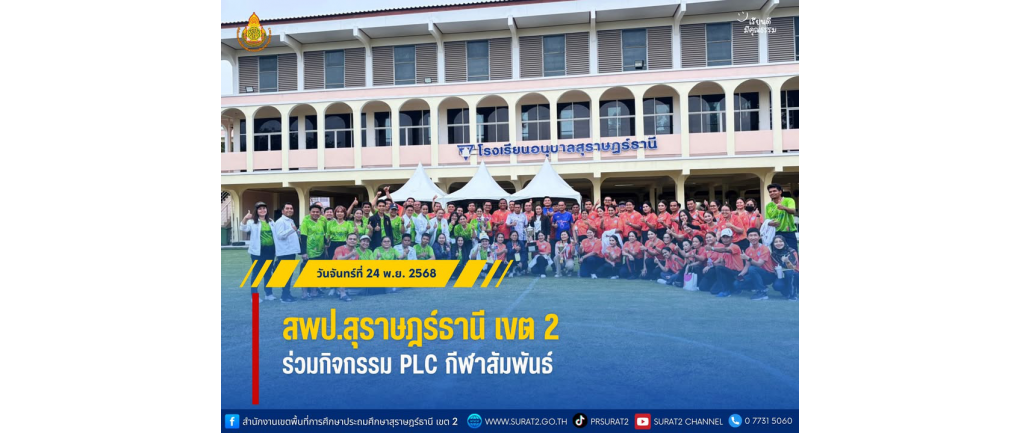 สพป.สุราษฎร์ธานี เขต 2 ร่วมกิจกรรม PLC กีฬาสัมพันธ์ . วันจันทร์ที่ 24 พฤศจิกายน พ.ศ. 2568 — นางสาวปวิชญา สินน้อย ผู้อำนวยการสำนักงานเขตพื้นที่การศึกษาประถมศึกษาสุราษฎร์ธานี เขต 2 ร่วมกิจกรรม PLC กีฬาสัมพันธ์ กับคณะศึกษาดูงานจากโครงการพัฒนาข้าราชการครูและบุคลากรทางการศึกษา ก่อนแต่งตั้งให้ดำรงตำแหน่งผู้อำนวยการ สำนักงานเขตพื้นที่การศึกษา สังกัด สำนักงานคณะกรรมการการศึกษาขั้นพื้นฐาน ณ โรงเรียนอนุบาลสุราษฎร์ธานี อ.เมืองฯ จ.สุราษฎร์ธานี