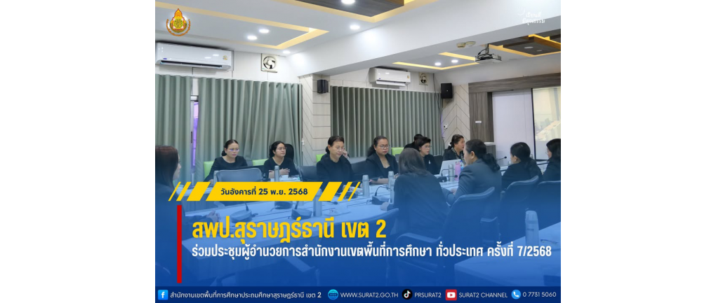 สพป.สุราษฎร์ธานี เขต 2 ร่วมประชุมผู้อำนวยการสำนักงานเขตพื้นที่การศึกษา ทั่วประเทศ ครั้งที่ 7/2568 . วันอังคารที่ 25 พฤศจิกายน พ.ศ. 2568 — นางสาวปวิชญา สินน้อย ผู้อำนวยการสำนักงานเขตพื้นที่การศึกษาประถมศึกษาสุราษฎร์ธานี เขต 2 พร้อมด้วยผู้อำนวยการกลุ่ม/หน่วย เข้าร่วมการประชุมผู้อำนวยการสำนักงานเขตพื้นที่การศึกษา ทั่วประเทศ ครั้งที่ 7/2568 ผ่านระบบ Video Conference เพื่อรับทราบข้อราชการที่สำคัญจากสำนักงานคณะกรรมการการศึกษาขั้นพื้นฐาน ณ ห้องประชุมพุนพิน สพป.สุราษฎร์ธานี เขต 2 การประชุมดังกล่าวได้รับเกียรติจาก ดร.พิเชฐ โพธิ์ภักดี เลขาธิการคณะกรรมการการศึกษาขั้นพื้นฐาน เป็นประธานการประชุม ร่วมด้วย ดร.วิษณุ ทรัพย์สมบัติ และนางภัทริยาวรรณ พันธุ์น้อย รองเลขาธิการคณะกรรมการการศึกษาขั้นพื้นฐาน โดยได้แจ้งข้อราชการสำคัญเกี่ยวกับการบริหารจัดการงานตามนโยบายของสำนักงานคณะกรรมการการศึกษาขั้นพื้นฐาน รวมถึงการติดตามสถานการณ์อุทกภัยในพื้นที่จังหวัดทางภาคใต้ เพื่อเตรียมความพร้อมด้านข้อมูลในการให้ความช่วยเหลือสถานศึกษา นักเรียน ครู และบุคลากรในสังกัดอย่างรวดเร็วและเหมาะสมต่อไป
