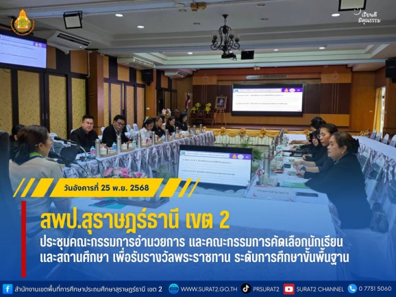 สพป.สุราษฎร์ธานี เขต 2 ประชุมคณะกรรมการอำนวยการ และคณะกรรมการคัดเลือกนักเรียนและสถานศึกษา เพื่อรับรางวัลพระราชทาน ระดับการศึกษาขั้นพื้นฐาน . วันอังคารที่ 25 พฤศจิกายน พ.ศ. 2568 — นางสาวปวิชญา สินน้อย ผู้อำนวยการสำนักงานเขตพื้นที่การศึกษาประถมศึกษาสุราษฎร์ธานี เขต 2 มอบหมายให้นางสงวนรัตน์ คงนุ่ม รองผู้อำนวยการสำนักงานเขตพื้นที่การศึกษาประถมศึกษาสุราษฎร์ธานี เขต 2 เป็นประธานการประชุมคณะกรรมการอำนวยการ และคณะกรรมการคัดเลือกนักเรียนและสถานศึกษา เพื่อรับรางวัลพระราชทาน ระดับการศึกษาขั้นพื้นฐาน ประจำปีการศึกษา 2568 ระดับจังหวัด ครั้งที่ 1/2568 การประชุมดังกล่าวจัดขึ้น ณ ห้องประชุมไชยชนะวดี สพป.สุราษฎร์ธานี เขต 2 โดยมีคณะกรรมการจากหน่วยงานและสถานศึกษาต่าง ๆ เข้าร่วม เพื่อพิจารณาแนวทางการคัดเลือกและประเมินผู้สมควรได้รับรางวัลพระราชทานให้เป็นไปด้วยความเรียบร้อย มีประสิทธิภาพ และเป็นไปตามเกณฑ์ที่กระทรวงศึกษาธิการกำหนด