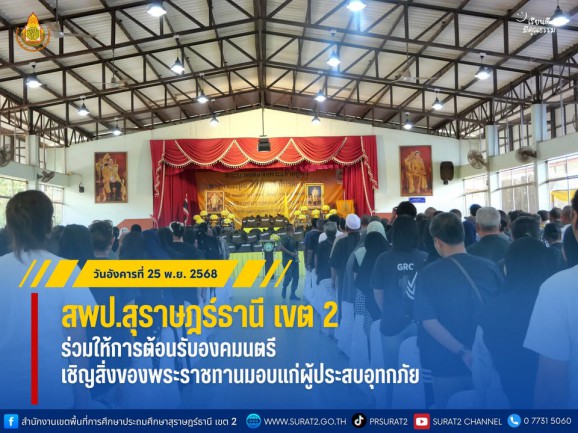 สพป.สุราษฎร์ธานี เขต 2 ร่วมให้การต้อนรับองคมนตรี เชิญสิ่งของพระราชทานมอบแก่ผู้ประสบอุทกภัย . วันอังคารที่ 25 พฤศจิกายน พ.ศ. 2568 — พระบาทสมเด็จพระเจ้าอยู่หัว ทรงพระกรุณาโปรดเกล้าโปรดกระหม่อมให้ พลเอก ดาว์พงษ์ รัตนสุวรรณ องคมนตรี ร่วมกับมูลนิธิราชประชานุเคราะห์ ในพระบรมราชูปถัมภ์ เชิญสิ่งของพระราชทานมอบแก่ประชาชนผู้ประสบอุทกภัยในพื้นที่อำเภอไชยา จังหวัดสุราษฎร์ธานี จำนวน 1,997 ชุด และสิ่งของพระราชทานสำหรับเด็ก จำนวน 100 ชุด โดยมอบแก่ผู้ว่าราชการจังหวัดสุราษฎร์ธานี และนายอำเภอไชยา ณ โรงเรียนวัดพุมเรียง อำเภอไชยา จังหวัดสุราษฎร์ธานี ในการนี้ นายจุมพฏ วรรณฉัตรสิริ ผู้ว่าราชราชการจังหวัดสุราษฎร์ธานี ได้กล่าวรายงานสถานการณ์อุทกภัยที่เกิดขึ้นในพื้นที่จังหวัดสุราษฎร์ธานี พร้อมกล่าวแสดงสำนึกในพระมหากรุณาธิคุณของพระบาทสมเด็จพระเจ้าอยู่หัว และสมเด็จพระนางเจ้าฯ พระบรมราชินี ที่ทรงมีต่อพสกนิกรชาวไทยและพี่น้องผู้ประสบภัยในพื้นที่ ทั้งนี้ นางสาวปวิชญา สินน้อย ผู้อำนวยการสำนักงานเขตพื้นที่การศึกษาประถมศึกษาสุราษฎร์ธานี เขต 2 พร้อมด้วยคณะครูโรงเรียนวัดพุมเรียง ร่วมให้การต้อนรับองคมนตรีและคณะ สำนักงานเขตพื้นที่การศึกษาประถมศึกษาสุราษฎร์ธานี เขต 2 ขอน้อมสำนึกในพระมหากรุณาธิคุณเป็นล้นพ้น อันหาที่สุดมิได้ . ภาพเพิ่มเติม : https://drive.google.com/drive/folders/1WTIbwYmEGdc441Olj3cbOlMUrUyGL7W5?usp=drive_link