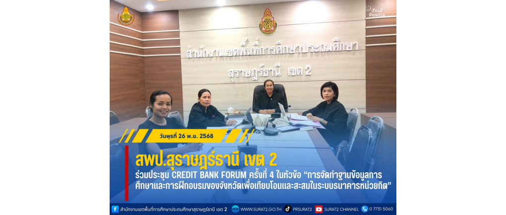 วันพุธที่ 26 พฤศจิกายน พ.ศ. 2568 — นางสาวปวิชญา สินน้อย ผู้อำนวยการสำนักงานเขตพื้นที่การศึกษาประถมศึกษาสุราษฎร์ธานี เขต 2 มอบหมายให้ นางสงวนรัตน์ คงนุ่ม รองผู้อำนวยการสำนักงานเขตพื้นที่การศึกษาประถมศึกษาสุราษฎร์ธานี เขต 2 พร้อมด้วยบุคลากรที่เกี่ยวข้อง ร่วมประชุม Credit Bank Forum ครั้งที่ 4 ในหัวข้อ “การจัดทำฐานข้อมูลการศึกษาและการฝึกอบรมของจังหวัดเพื่อเทียบโอนและสะสมในระบบธนาคารหน่วยกิต” ผ่านการถ่ายทอดสดทาง Facebook Live:Thailland NQF ณ ห้องประชุม ท่าฉาง สพป.สุราษฎร์ธานี เขต 2