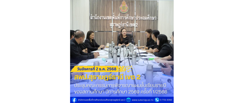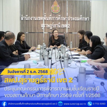 สพป.สุราษฎร์ธานี เขต 2 ประชุมคณะกรรมการพิจารณาแผนชั้นเรียนรายปีของสถานศึกษา ปีการศึกษา 2569 (ครั้งที่ 1/2568) . วันอังคารที่ 2 ธันวาคม 2568 — นางสาวปวิชญา สินน้อย ผู้อำนวยการสำนักงานเขตพื้นที่การศึกษาประถมศึกษาสุราษฎร์ธานี เขต 2 เป็นประธานการประชุมคณะกรรมการพิจารณาแผนชั้นเรียนรายปีของสถานศึกษา ปีการศึกษา 2569 ครั้งที่ 1/2568 เพื่อร่วมกันพิจารณาและให้ความเห็นชอบข้อมูลแผนชั้นเรียนของโรงเรียนในสังกัด ณ ห้องประชุมพุนพิน ชั้น 3 สพป.สุราษฎร์ธานี เขต 2