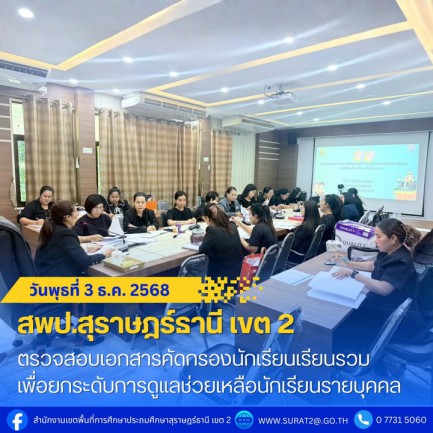 สพป.สุราษฎร์ธานี เขต 2 ตรวจสอบเอกสารคัดกรองนักเรียนเรียนรวม ของสถานศึกษา ภาคเรียนที่ 2 ปีการศึกษา 2568 . วันพุธที่ 3 ธันวาคม 2568 นางสงวนรัตน์ คงนุ่ม รอง ผอ.สพป.สุราษฎร์ธานี เขต 2 เป็นประธานในการตรวจสอบเอกสารคัดกรองนักเรียนเรียนรวมของสถานศึกษา ภาคเรียนที่ 2 ปีการศึกษา 2568 ณ ห้องประชุมท่าฉาง สพป.สฎ.2 📝 โดยคณะครูผู้รับผิดชอบงานเรียนรวมจาก 15 โรงเรียน ได้นำเอกสารสำคัญ อาทิ แบบคัดกรอง, แผน IEP และร่องรอยการพัฒนาผู้เรียน มาเข้ารับการตรวจสอบความถูกต้อง เพื่อให้การจัดเก็บข้อมูลนักเรียนพิการและนักเรียนที่มีความบกพร่องทางการเรียนรู้เป็นไปอย่างมีประสิทธิภาพ และเกิดประโยชน์สูงสุดต่อตัวผู้เรียน