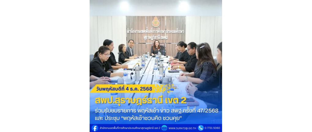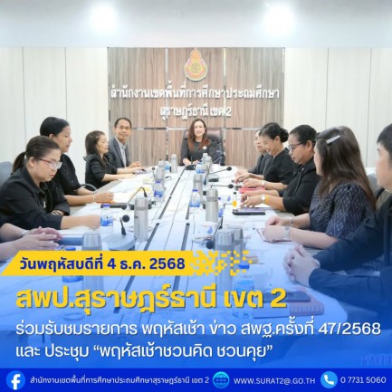 สพป.สุราษฎร์ธานี เขต 2 ร่วมรับชมรายการ พฤหัสเช้า ข่าว สพฐ.ครั้งที่ 47/2568 และ ประชุม “พฤหัสเช้าชวนคิด ชวนคุย” . วันพฤหัสบดีที่ 4 ธันวาคม พ.ศ. 2568 — นางสาวปวิชญา สินน้อย ผู้อำนวยการสำนักงานเขตพื้นที่การศึกษาประถมศึกษาสุราษฎร์ธานี เขต 2 พร้อมด้วย รองผู้อำนวยการสำนักงานเขตพื้นที่ฯ รวมถึงผู้อำนวยการกลุ่ม/หน่วย และบุคลากรที่เกี่ยวข้อง เข้าร่วมรับชมรายการ “พฤหัสเช้า ข่าว สพฐ.” ครั้งที่ 47/2568 ผ่านระบบ Zoom Meeting ณ ห้องประชุมพุนพิน สพป.สุราษฎร์ธานี เขต 2 การรับชมครั้งนี้มีวัตถุประสงค์เพื่อรับทราบนโยบาย ข่าวสารสำคัญ และแนวทางการขับเคลื่อนการศึกษาของสำนักงานคณะกรรมการการศึกษาขั้นพื้นฐาน (สพฐ.) เพื่อนำไปสู่การปฏิบัติอย่างเป็นรูปธรรมในระดับสำนักงานเขตพื้นที่การศึกษาและสถานศึกษาในสังกัด ภายหลังการรับชมรายการฯ ผู้อำนวยการสำนักงานเขตพื้นที่ฯ ได้เป็นประธานการประชุม “พฤหัสเช้าชวนคิด ชวนคุย” เปิดโอกาสให้แต่ละกลุ่ม/หน่วย รายงานความก้าวหน้าการดำเนินงาน แลกเปลี่ยนความคิดเห็น และร่วมกันหาแนวทางพัฒนาและปรับปรุงกระบวนการทำงานให้มีประสิทธิภาพยิ่งขึ้น