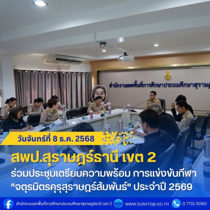 สพป.สุราษฎร์ธานี เขต 2 ร่วมประชุมเตรียมความพร้อม การแข่งขันกีฬา จตุรมิตรคุรุสุราษฎร์สัมพันธ์ ประจำปี 2569 วันจันทร์ที่ 8 ธันวาคม 2568 – เวลา 13.30 น. นางสาวปวิชญา สินน้อย ผู้อำนวยการสำนักงานเขตพื้นที่การศึกษาประถมศึกษาสุราษฎร์ธานี เขต 2 พร้อมด้วย นางสาวกิตติยา ชูช่วย ผู้อำนวยการกลุ่มอำนวยการ และว่าที่ ร.ต. ธีรชาติ แสงแก้ว นักจัดการงานทั่วไปชำนาญการ เข้าร่วมการประชุมเตรียมการจัดแข่งขันกีฬา จตุรมิตรคุรุสุราษฎร์สัมพันธ์ ประจำปี 2569 ณ ห้องประชุมตาปี สำนักงานเขตพื้นที่การศึกษาประถมศึกษาสุราษฎร์ธานี เขต 1 การประชุมในครั้งนี้จัดขึ้นโดยมี สำนักงานเขตพื้นที่การศึกษาประถมศึกษาสุราษฎร์ธานี เขต 1 เป็นเจ้าภาพ เพื่อหารือและวางแผนการดำเนินงานร่วมกันระหว่างสำนักงานเขตพื้นที่การศึกษาประถมศึกษา/มัธยมศึกษา ในจังหวัดสุราษฎร์ธานี ทั้ง 4 เขต โดยมีวัตถุประสงค์เพื่อเสริมสร้างความสัมพันธ์อันดี ความสามัคคีระหว่างผู้บริหารการศึกษา ผู้บริหารสถานศึกษา ข้าราชการครู และบุคลากรทางการศึกษา ผ่านกิจกรรมกีฬาและนันทนาการ ในการนี้ ผอ.สพป.สุราษฎร์ธานี เขต 2 ได้ร่วมพิจารณากำหนดการและรูปแบบกิจกรรมเพื่อให้การจัดการแข่งขันเป็นไปด้วยความเรียบร้อยและบรรลุวัตถุประสงค์ในการสร้างเครือข่ายความร่วมมือทางการศึกษาที่เข้มแข็งต่อไป ภาพถ่ายเพิ่มเติม :: https://photos.app.goo.gl/XoomcDEFV87jekwt7