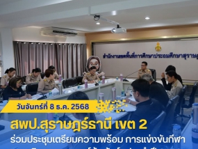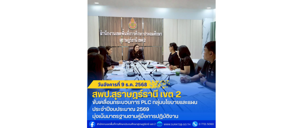 ผอ.สพป.สุราษฎร์ธานี เขต 2 เป็นประธานขับเคลื่อนกระบวนการ PLC กลุ่มนโยบายและแผน ประจำปีงบประมาณ 2569 มุ่งเน้นมาตรฐานตามคู่มือการปฏิบัติงาน . วันอังคารที่ 9 ธันวาคม 2568 เวลา 14.00 น.-- นางสาวปวิชญา สินน้อย ผู้อำนวยการสำนักงานเขตพื้นที่การศึกษาประถมศึกษาสุราษฎร์ธานี เขต 2 เป็นประธานในการประชุมและดำเนินกิจกรรมชุมชนแห่งการเรียนรู้ทางวิชาชีพ (Professional Learning Community: PLC) ของกลุ่มนโยบายและแผน โดยมีบุคลากรในกลุ่มนโยบายและแผนเข้าร่วมประชุมอย่างพร้อมเพรียง ณ สำนักงานเขตพื้นที่การศึกษาประถมศึกษาสุราษฎร์ธานี เขต 2 สำหรับการประชุมในครั้งนี้ มีวัตถุประสงค์เพื่อร่วมกันทบทวน แลกเปลี่ยนเรียนรู้ และสร้างความเข้าใจเกี่ยวกับแนวทางการปฏิบัติงานตาม คู่มือการปฏิบัติงาน ประจำปีงบประมาณ 2569 เพื่อให้บุคลากรสามารถปฏิบัติหน้าที่ได้อย่างถูกต้อง เป็นไปในทิศทางเดียวกัน และสอดคล้องกับระเบียบราชการ ซึ่งจะส่งผลให้การบริหารจัดการงานนโยบายและแผนของเขตพื้นที่การศึกษามีประสิทธิภาพและประสิทธิผลสูงสุด