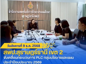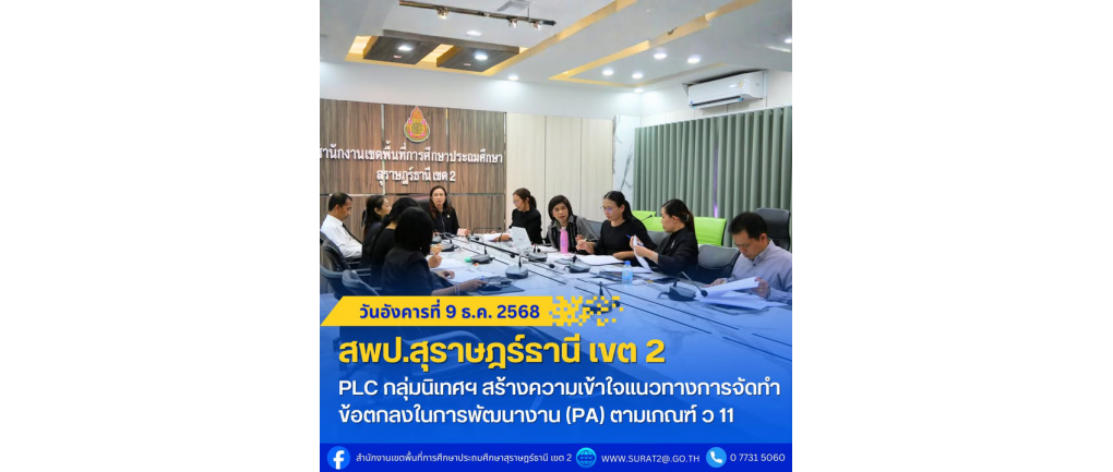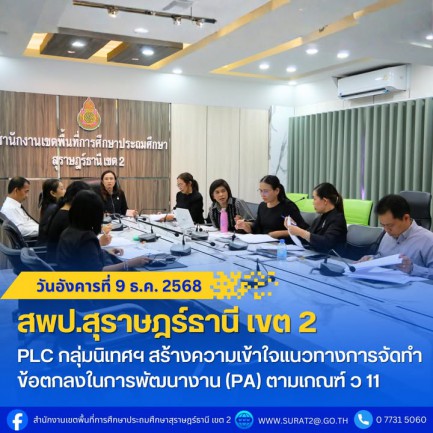 ผอ.สพป.สุราษฎร์ธานี เขต 2 เป็นประธานขับเคลื่อนกระบวนการ PLC กลุ่มนิเทศฯ สร้างความเข้าใจแนวทางการจัดทำข้อตกลงในการพัฒนางาน (PA) ตามเกณฑ์ ว 11 . วันที่ 9 ธันวาคม 2568 เวลา 15.30 น. -- นางสาวปวิชญา สินน้อย ผู้อำนวยการสำนักงานเขตพื้นที่การศึกษาประถมศึกษาสุราษฎร์ธานี เขต 2 เป็นประธานในการประชุมและขับเคลื่อนชุมชนแห่งการเรียนรู้ทางวิชาชีพ (Professional Learning Community: PLC) ของกลุ่มนิเทศ ติดตาม และประเมินผลการจัดการศึกษา โดยมีคณะศึกษานิเทศก์ทุกคนเข้าร่วมประชุมอย่างพร้อมเพรียง ณ ห้องประชุมพุนพิน ชั้น 3 สำนักงานเขตพื้นที่การศึกษาประถมศึกษาสุราษฎร์ธานี เขต 2 สำหรับการประชุม PLC ในครั้งนี้ มีวาระสำคัญในการสร้างความรู้ความเข้าใจเกี่ยวกับหลักเกณฑ์และวิธีการประเมินตำแหน่งและวิทยฐานะข้าราชการครูและบุคลากรทางการศึกษา ตำแหน่งศึกษานิเทศก์ (ตามหนังสือสำนักงาน ก.ค.ศ. ที่ ศธ 0206.3/ว 11) โดยเน้นย้ำในประเด็น แนวทางการจัดทำข้อตกลงในการพัฒนางาน (Performance Agreement : PA) ทั้งนี้ ที่ประชุมได้ร่วมกันศึกษาและวิเคราะห์รายละเอียดจากคู่มือการประเมินฯ ซึ่งประกอบด้วย การจัดทำข้อตกลงในการพัฒนางาน, การประเมินผลการพัฒนางานตามข้อตกลง และการประเมินเพื่อขอมีหรือเลื่อนวิทยฐานะ เพื่อให้ศึกษานิเทศก์สามารถดำเนินการประเมินได้อย่างถูกต้อง เป็นมาตรฐานเดียวกัน และสามารถนำไปขับเคลื่อนการพัฒนาคุณภาพการศึกษาของสถานศึกษาในสังกัดได้อย่างมีประสิทธิภาพ