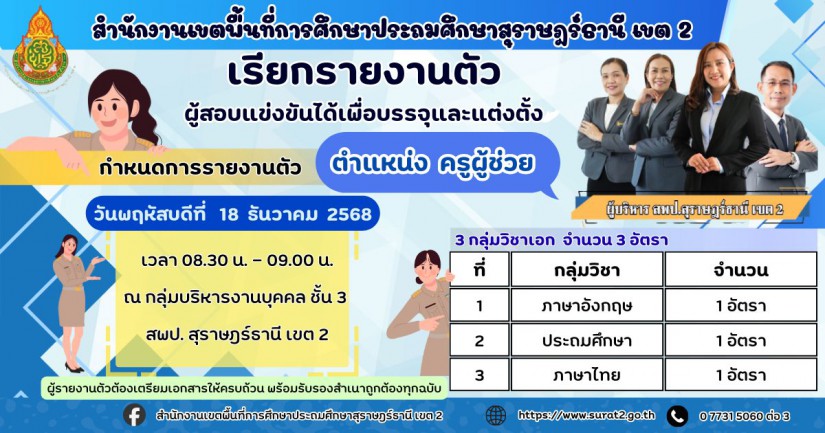 🗓 วันที่รายงานตัว: วันพฤหัสบดีที่ 18 ธันวาคม 2568 ⏰ เวลา: 08.30 น. – 09.00 น. 📍 สถานที่: ณ กลุ่มบริหารงานบุคคล ชั้น 3 สพป.สุราษฎร์ธานี เขต 2